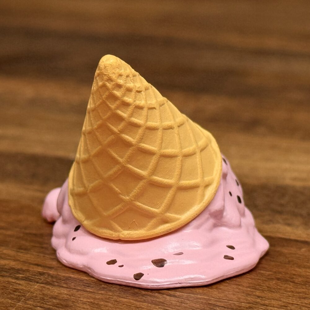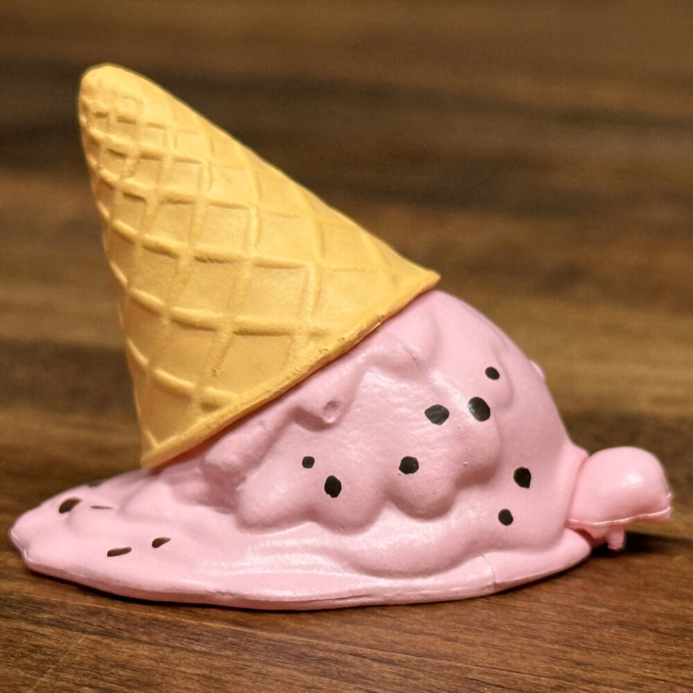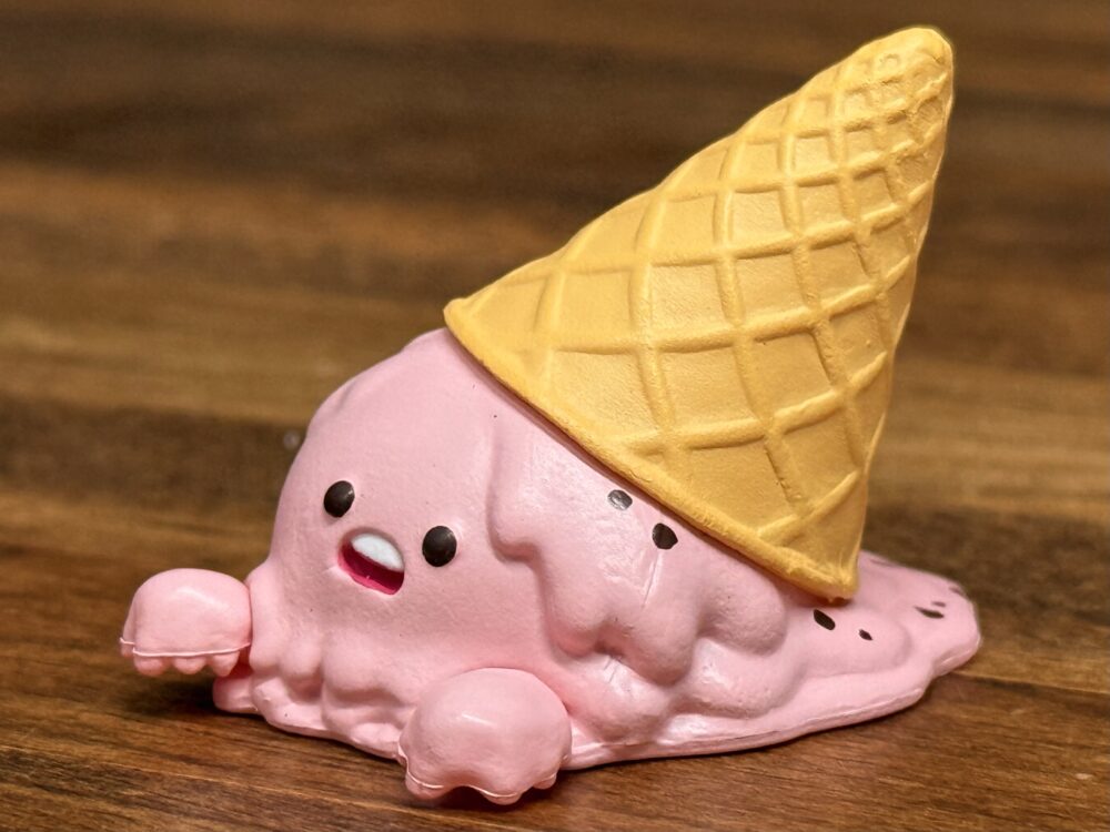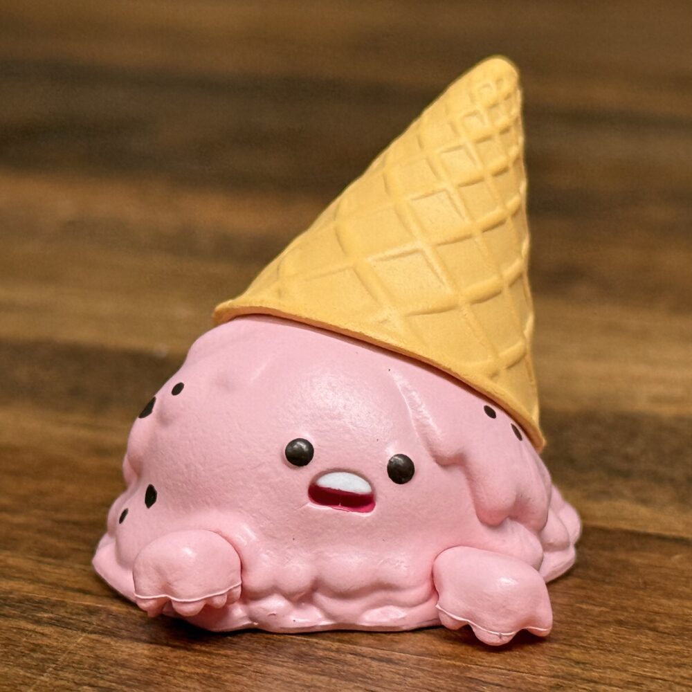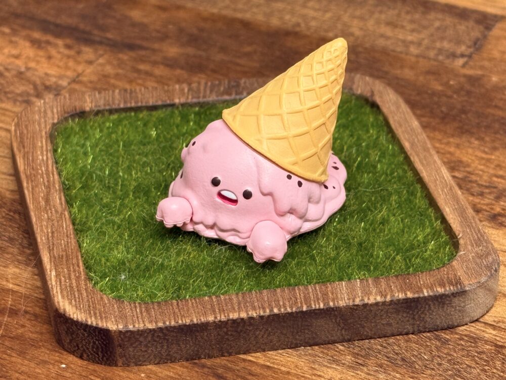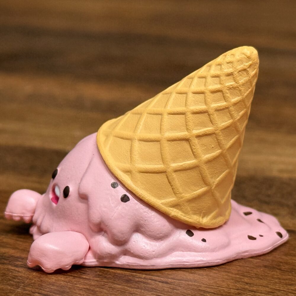 落っこちたアイスクリームが溶け出した感じのフォルムでワッフルコーンが実に美味しそう。黒い斑点があるのでストロベリーチョコチップみたいなフレーバーなのでしょうか。