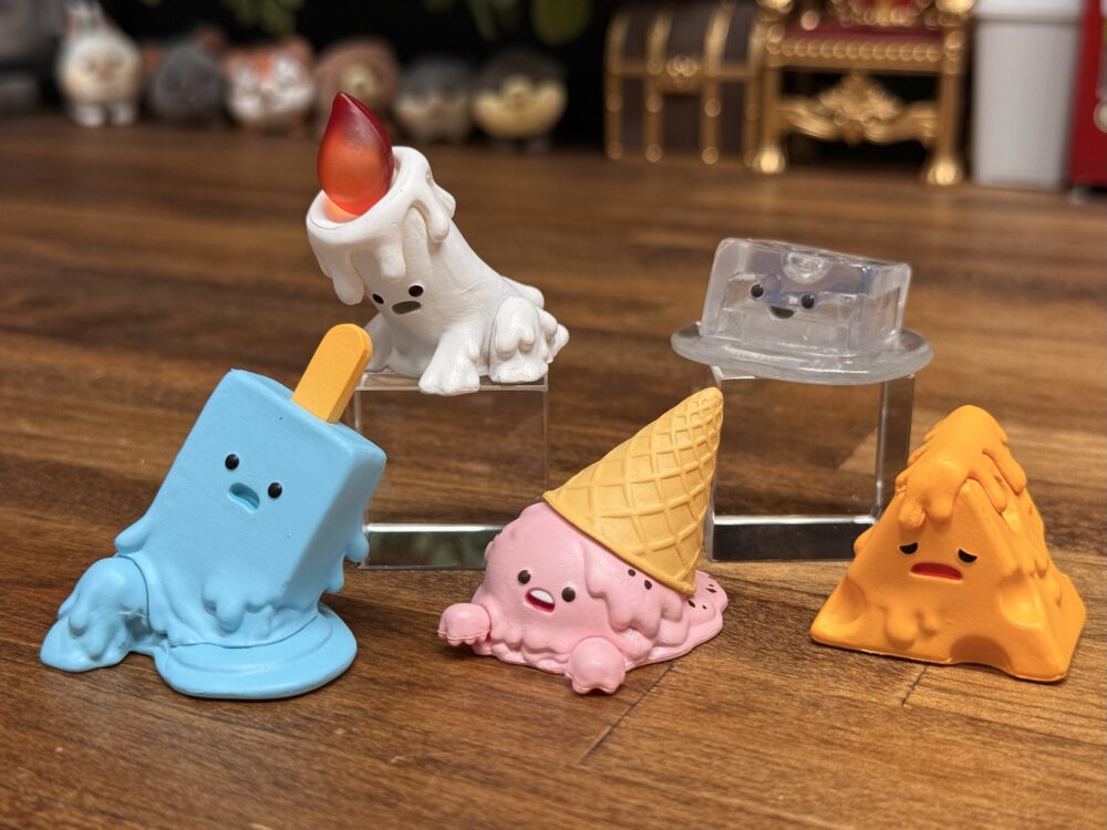 暑さに弱いキャラクター達が溶け出してしまった姿をマスコットにした「とけちゃうズ マスコットフィギュア」が2023年の夏に発売されました。2024年にはニューカラーver.が発売され、そしてこの2025年に第1弾の通常ver.が再販され現在店頭に並んでます。無事に全5種類コンプリートできたので順番に紹介していきたいと思います。