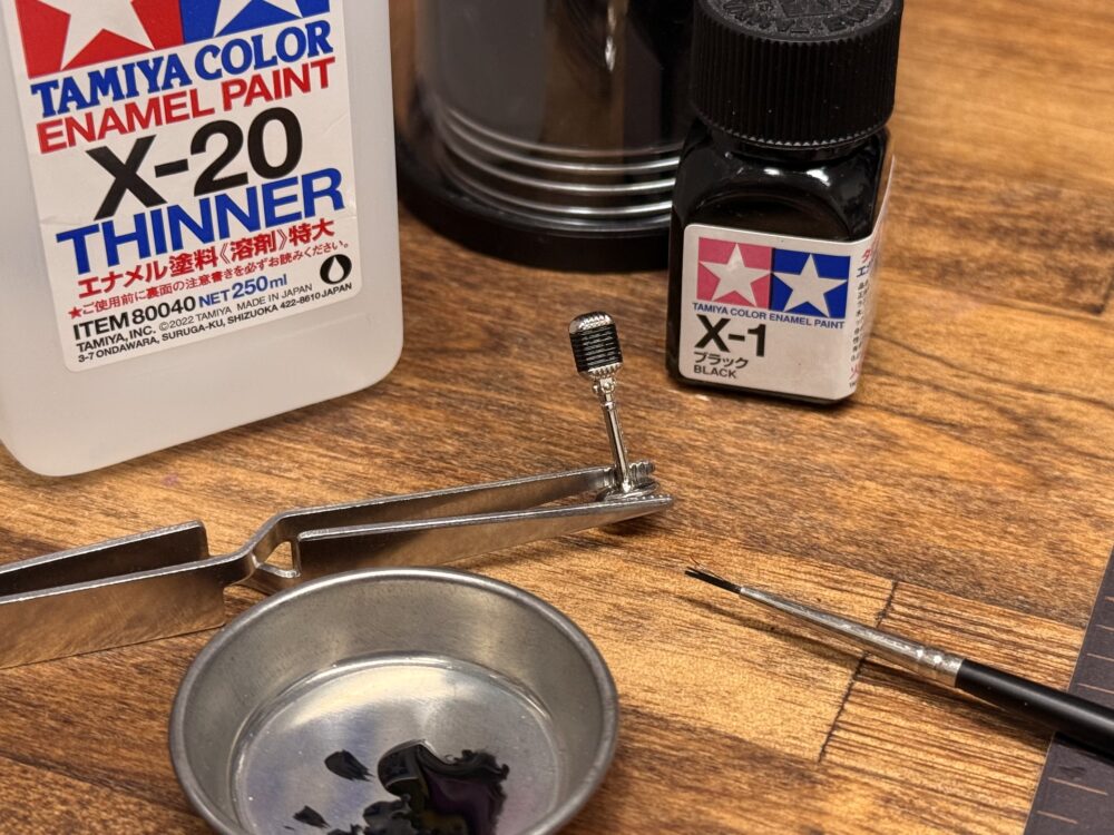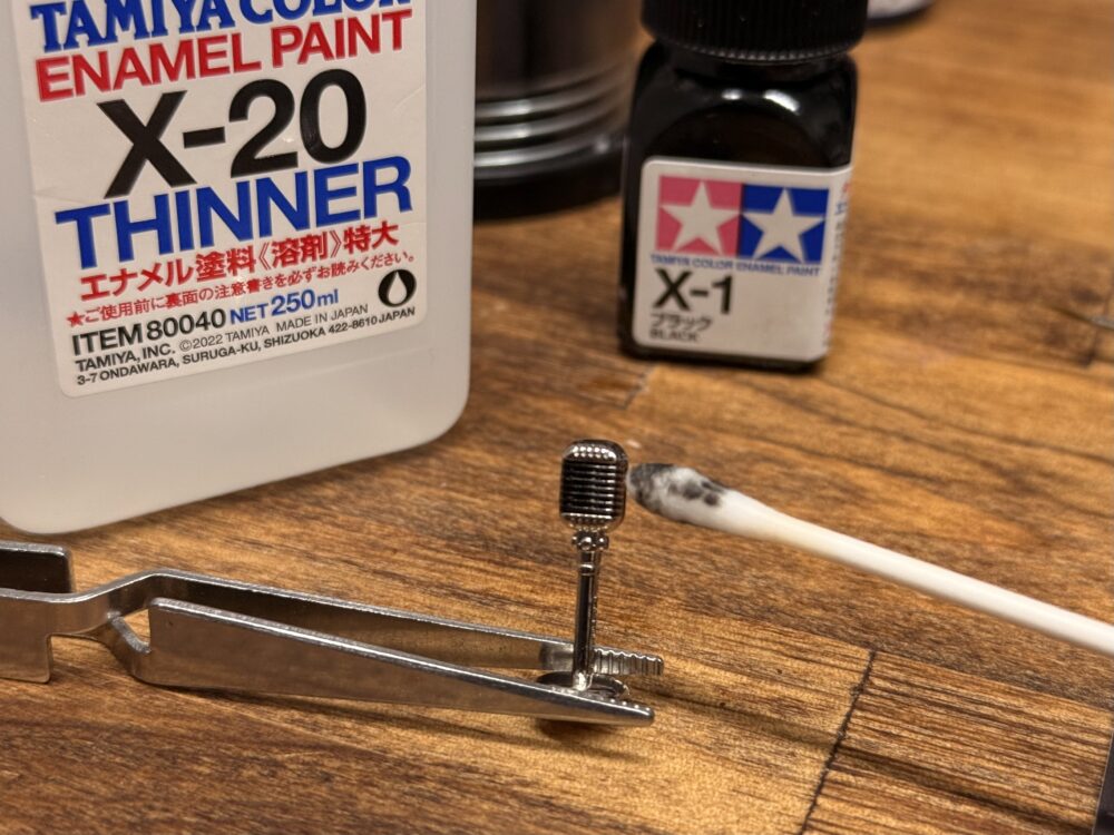 しっかり乾かした後に「エナメル塗料(溶剤)」を綿棒に付けて溝と直角になる方向に軽く押し当てると溝の塗料だけが残ってくれました。