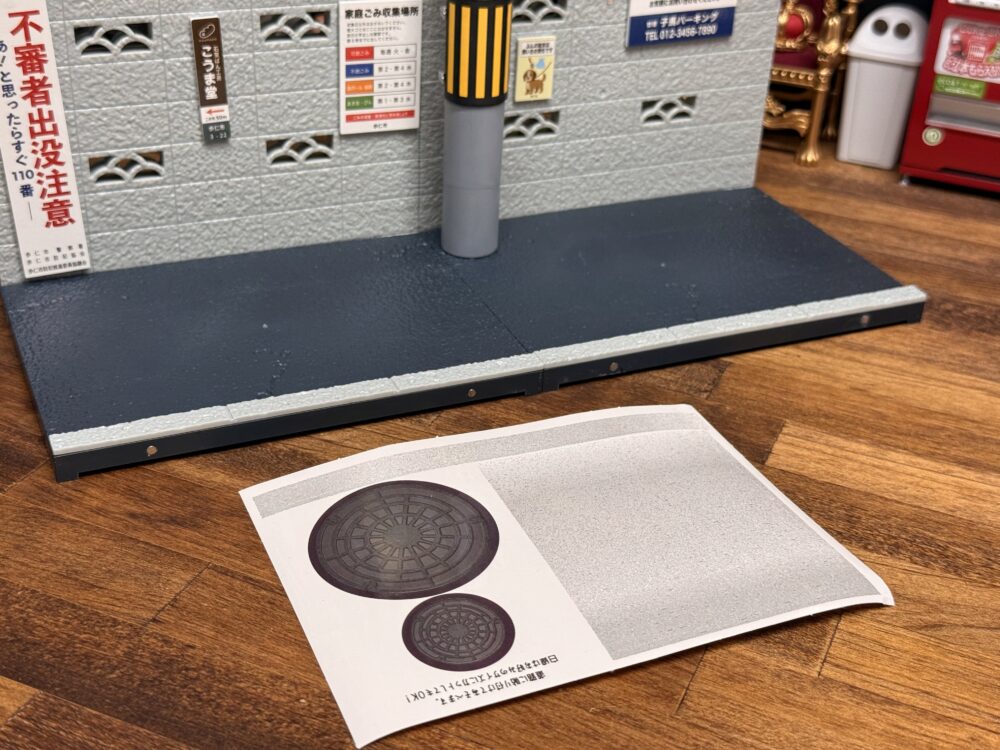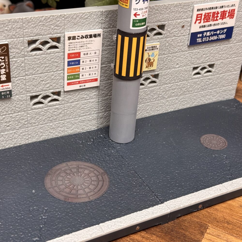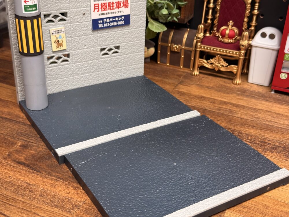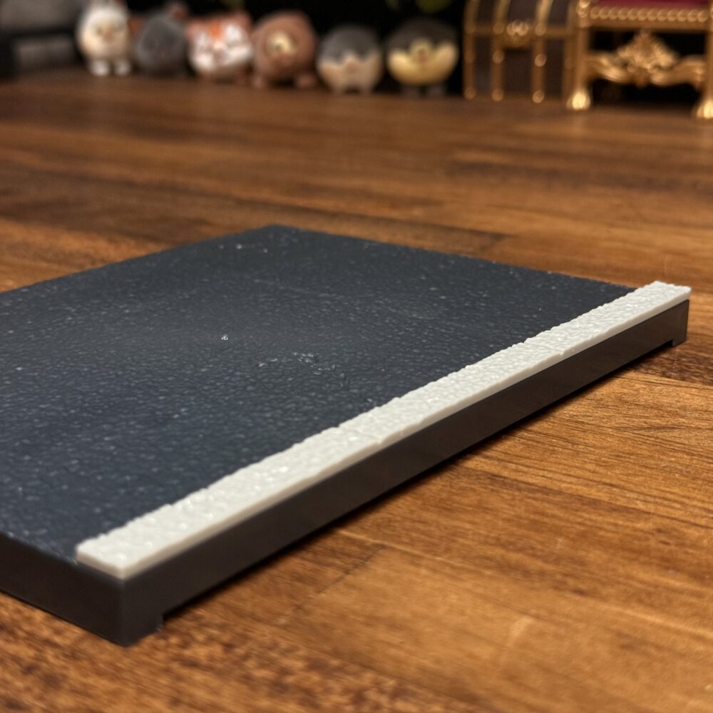 まずは生活する上で外に出れば見ない事はないアスファルト舗装のミニチュアです。スケールの表記はありませんが縁石のサイズを見る限り1/12スケールの可動フィギュアにちょうどいいサイズ感だと思います。