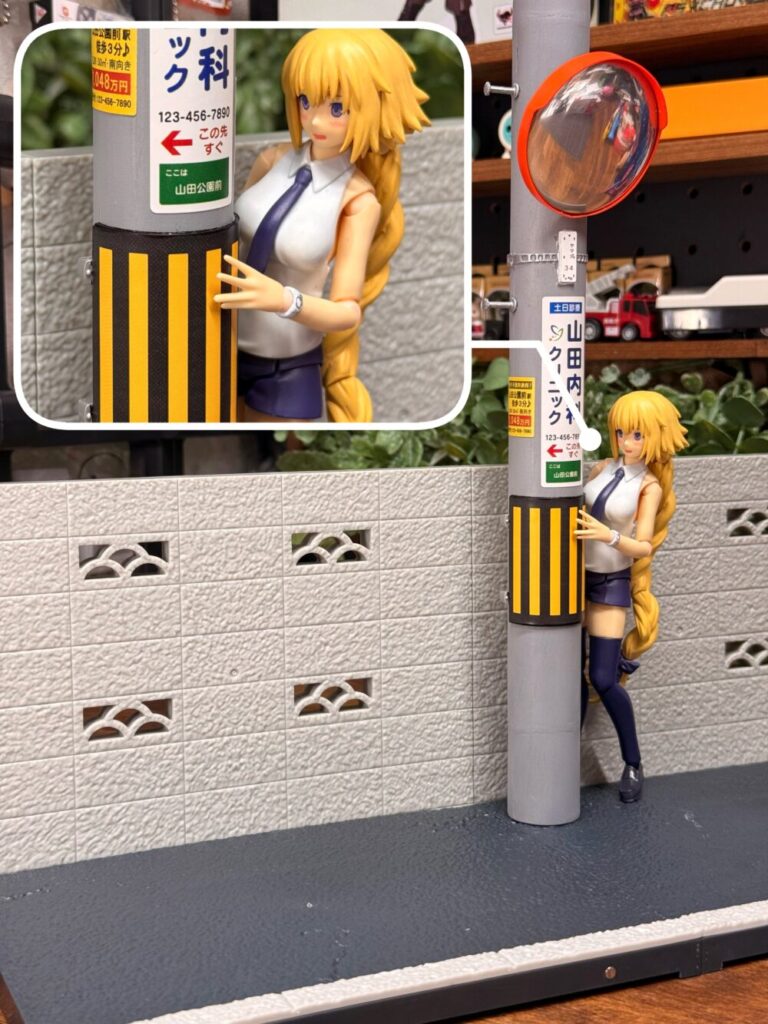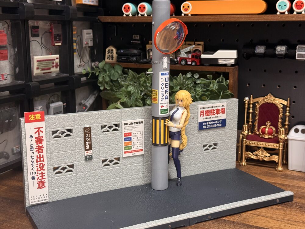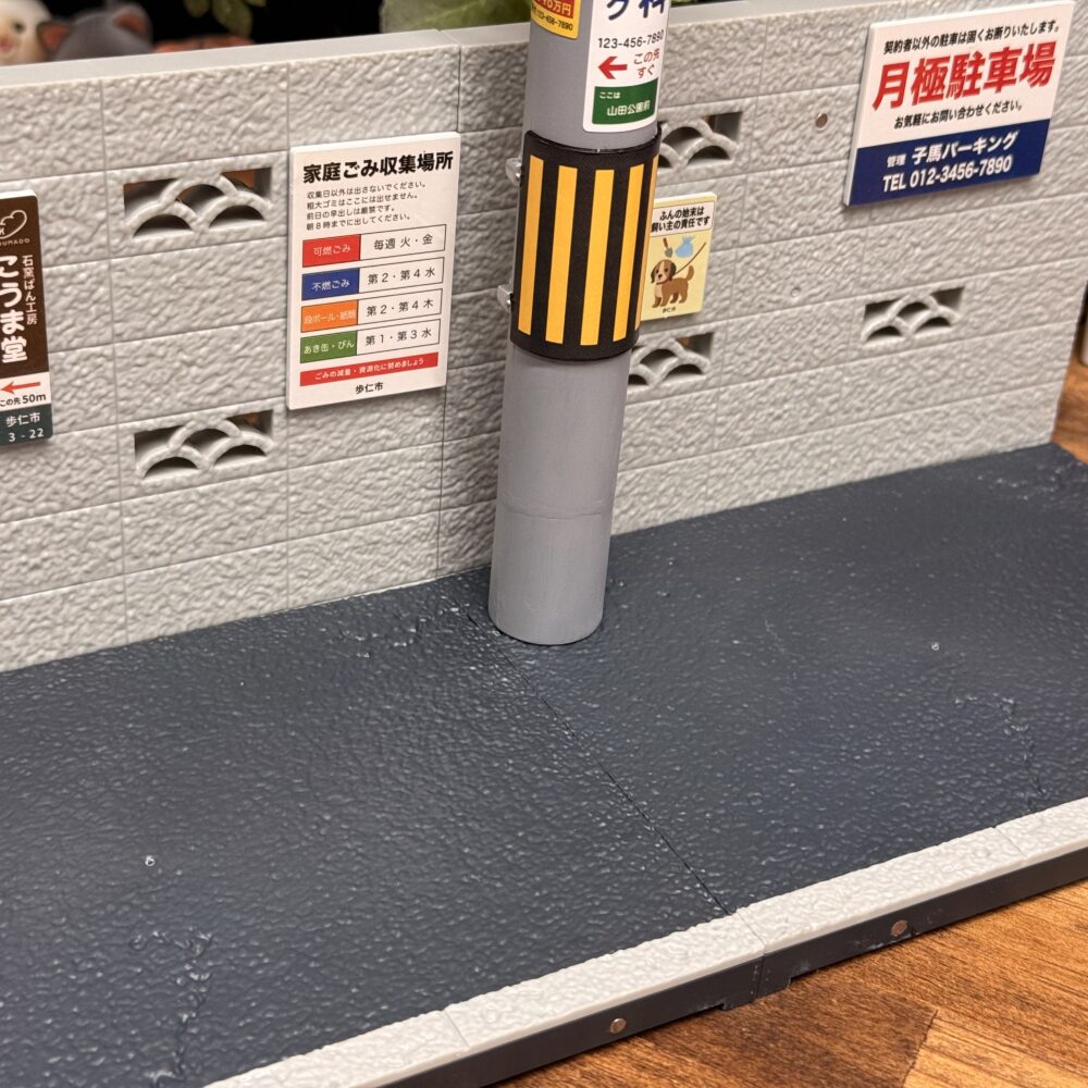 ブロック塀の造形はリアルですがこちらももうちょっとマットな質感だともっと良かったと思います。穴の開いた有孔ブロックが昔ながらのデザインなのでレトロな雰囲気を醸し出しています。
