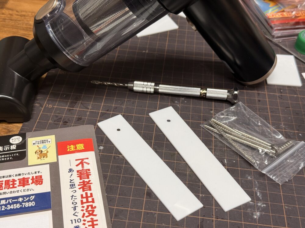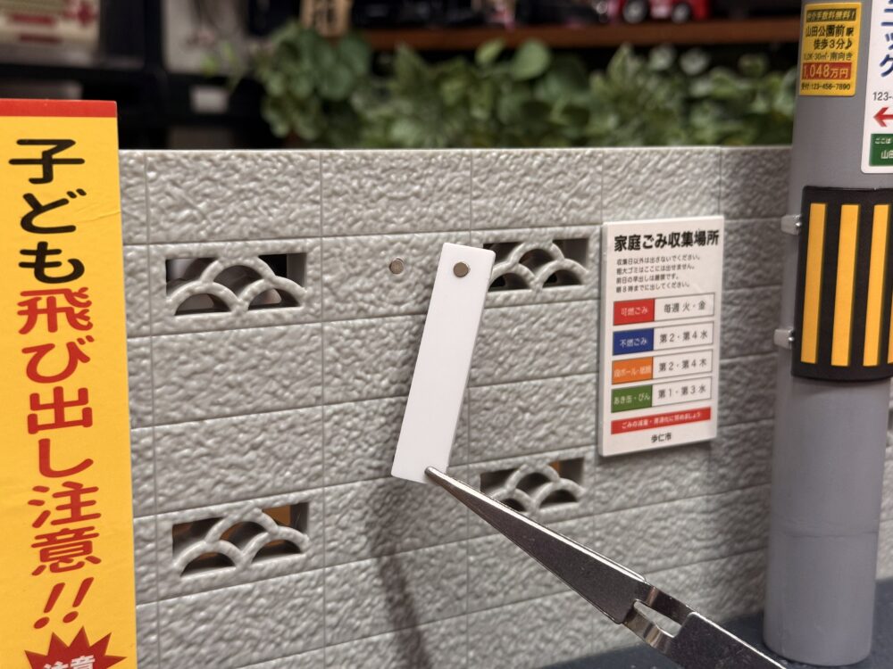 今回は「いつもの道路」と「よくみるブロック塀」と「町なかの表示板」を組み合わせて遊ぶ為、ネオジム磁石を仕込んでいこうと思います。