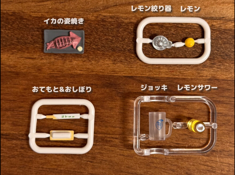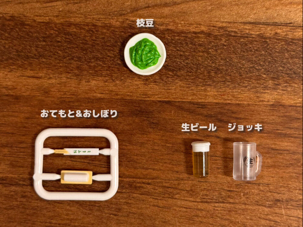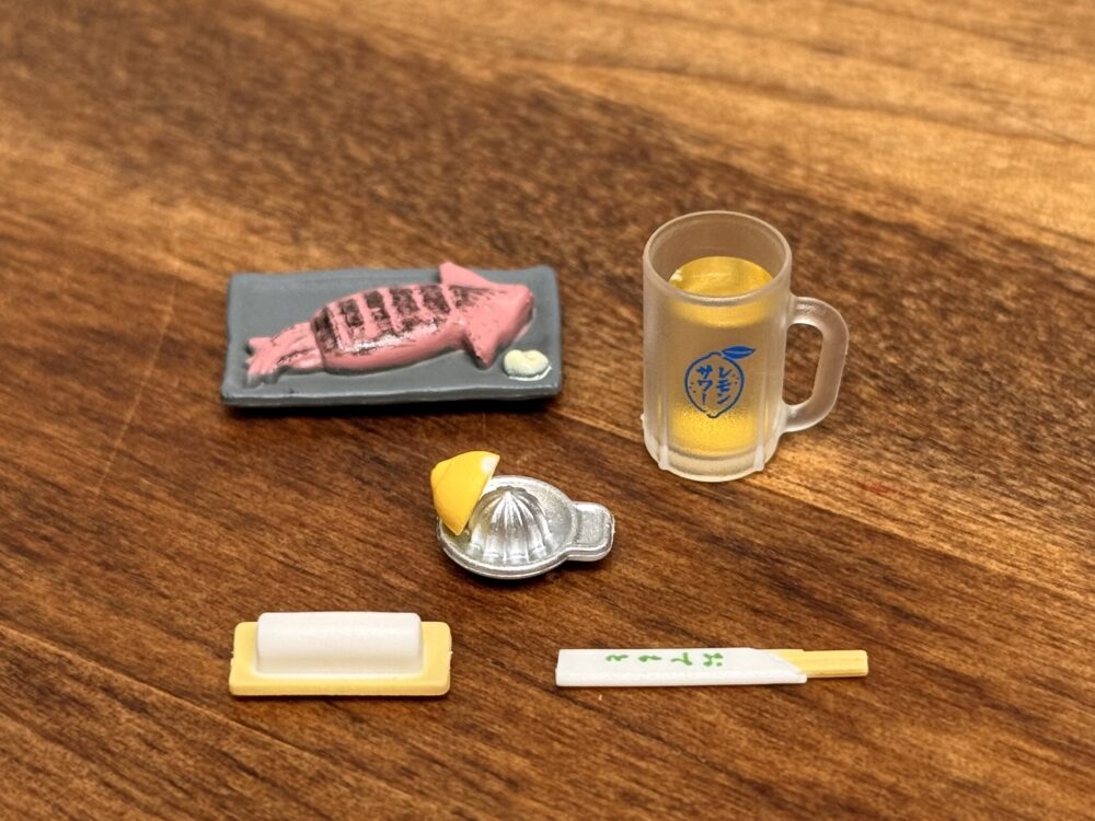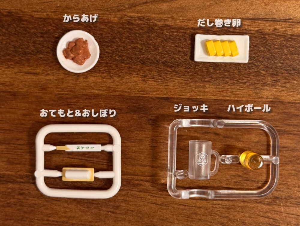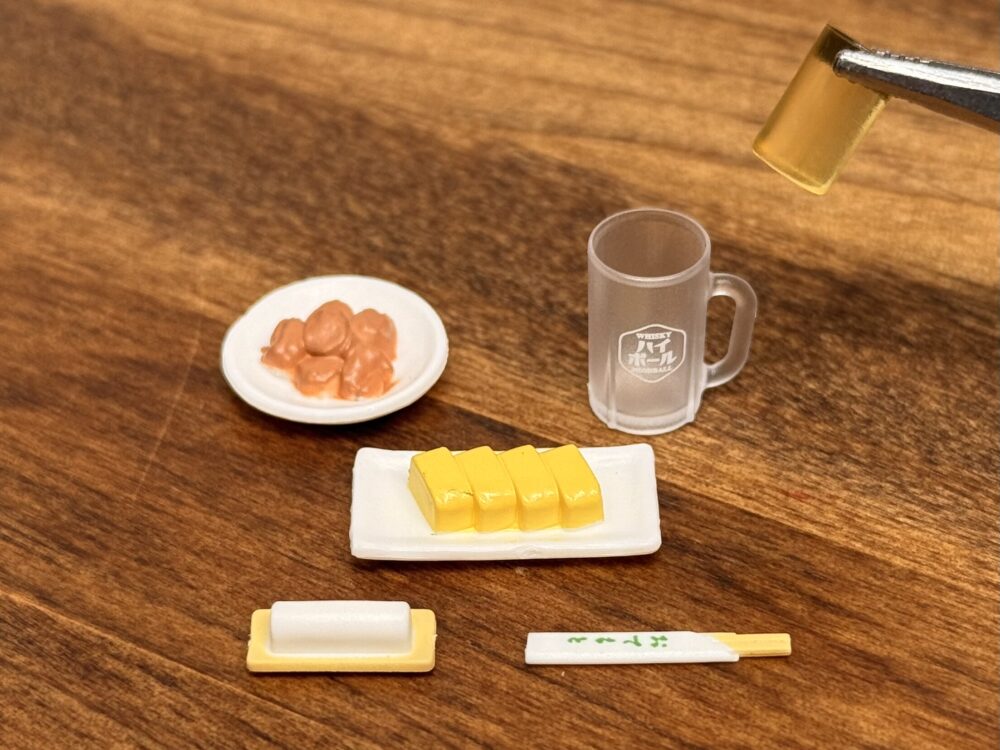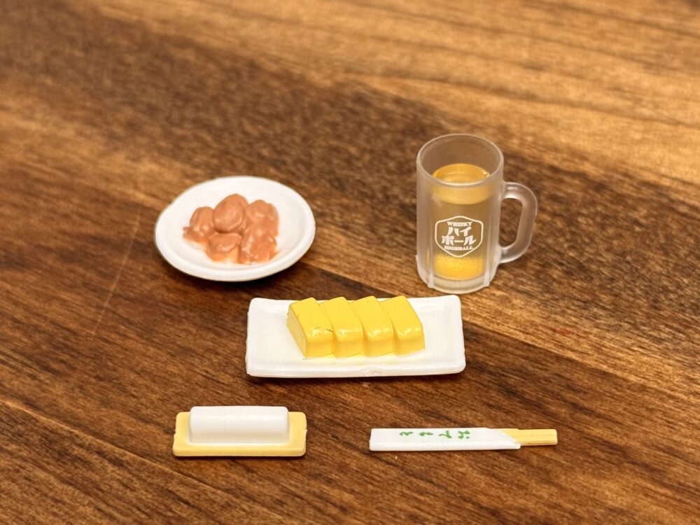 ミニブックを見てもセット名しか記載がないので実際のところ、付属しているミニチュアが何なのかは詳しく分かりません…。たぶん唐揚げとだし巻き卵だと思う…酒飲めないから居酒屋とか殆ど行かないし料理にも詳しくないから適当ですいません。