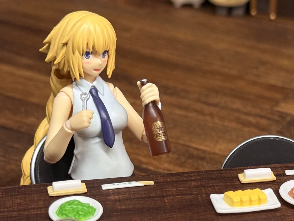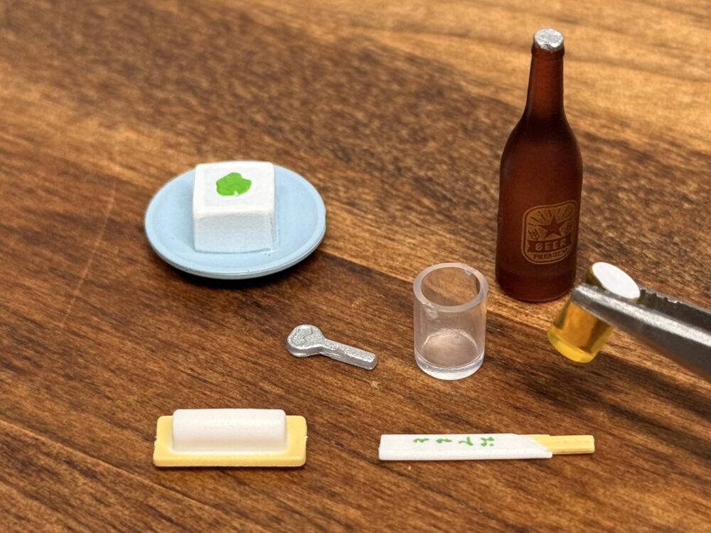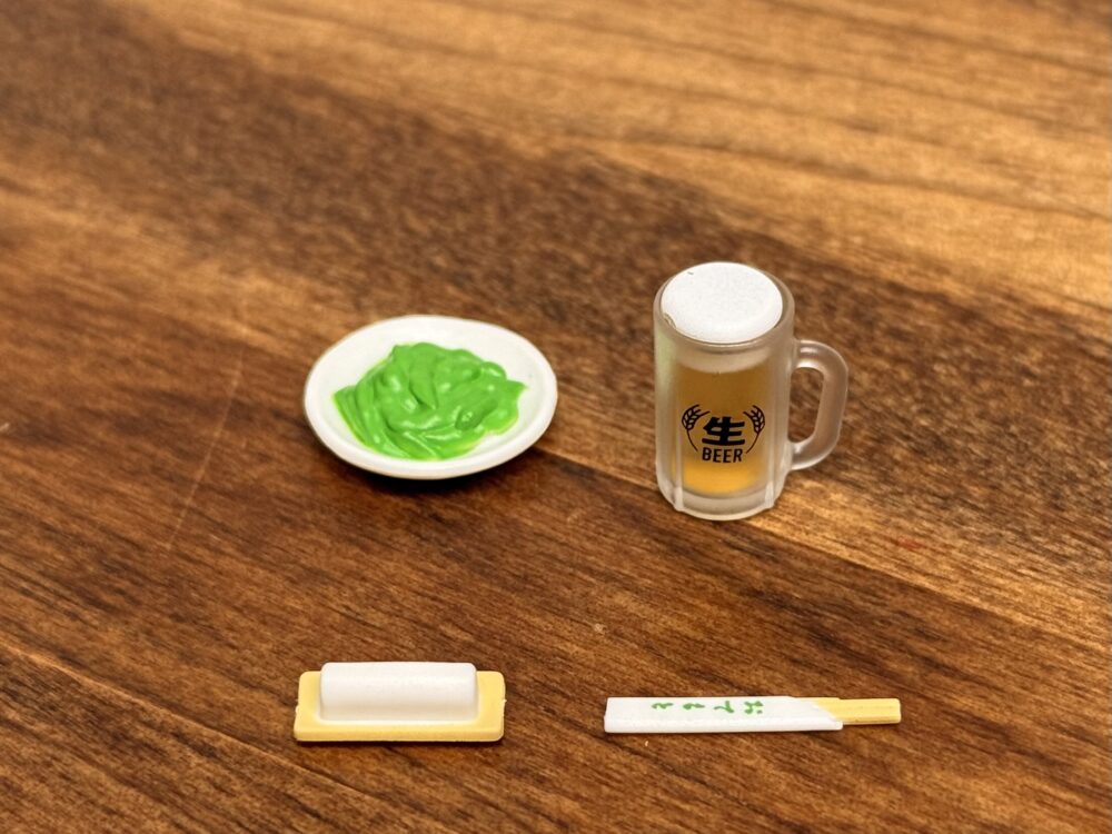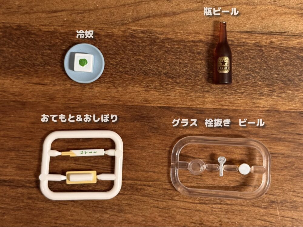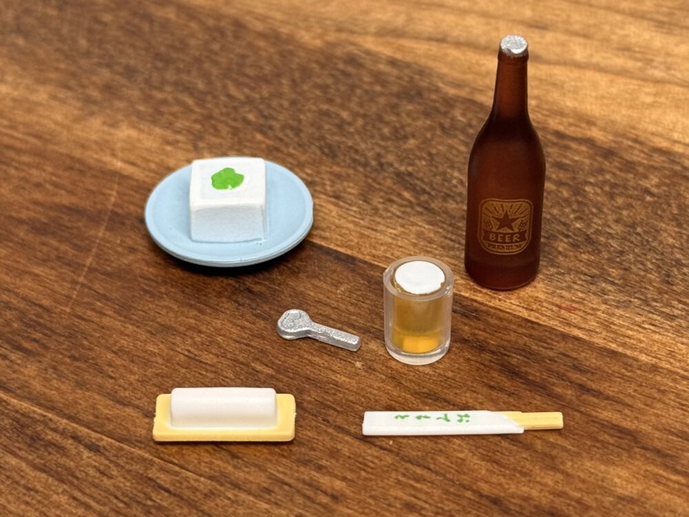 こちらは料理がシンプルな冷奴だけですが、なんとビール瓶だけでなく、グラスとビールが別パーツになっていて、1/12スケールの栓抜きが付いてておすすめです。