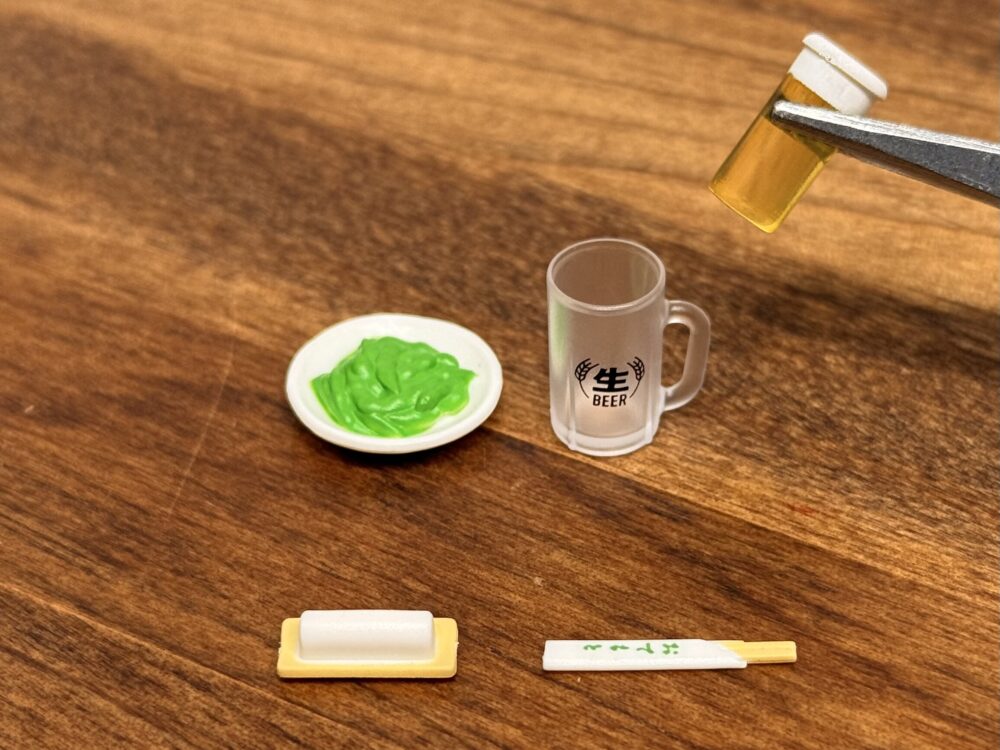 ですが今回の「極小生ビール」は付属品が素晴らしい!あまり見る事のない1/12スケールのおしぼりだったり、レモン絞り器や栓抜きといった、メインにはなれないけど一緒にあるだけでリアルさが一気に高くなる小物が付属している点と、お酒の中身がグラスやジョッキから取り外せるところが非常に良かったです。