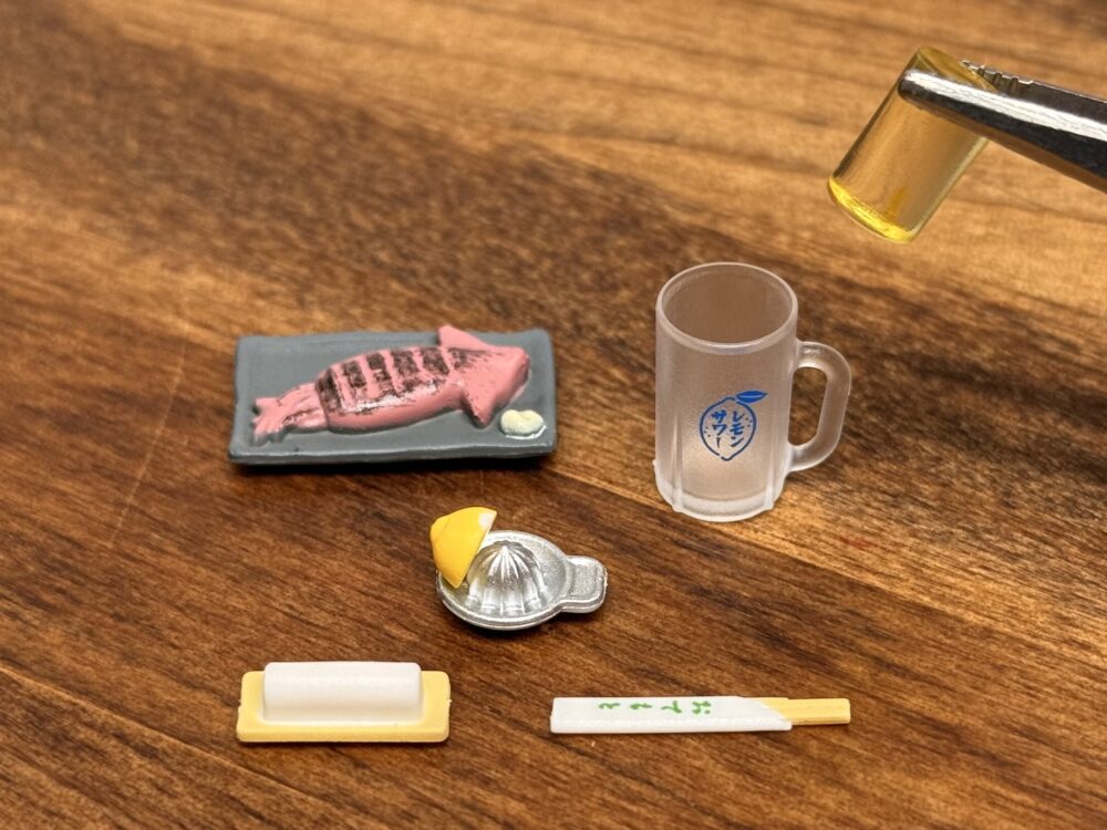 枝豆やからあげ、だし巻き卵は1色でしか塗装がされていませんでしたが、イカの姿焼きはリアルな焼き目が付いてます。マヨネーズっぽいモノもお皿にのってるのもポイントが高いですね。