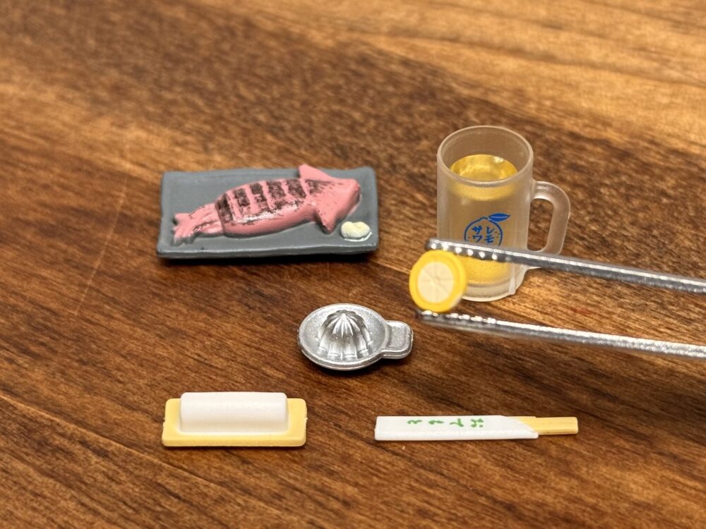 イカの姿焼きとかミニチュアは他にも見かけた事がありそうですが、1/12スケールのレモン絞り器は初めて見たかと思います。
