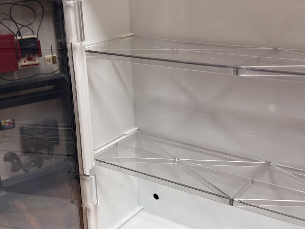 この様に前面のフレームを外す事によって透明棚板を写真みたいにスライドさせることができます。