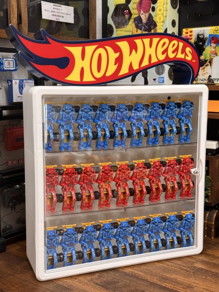 サイズ感を見てもらう為にホットウィールの「ゾンボット」を並べてみました。1段に9体並べる事ができるので3段並べると27体も収納できちゃいます。