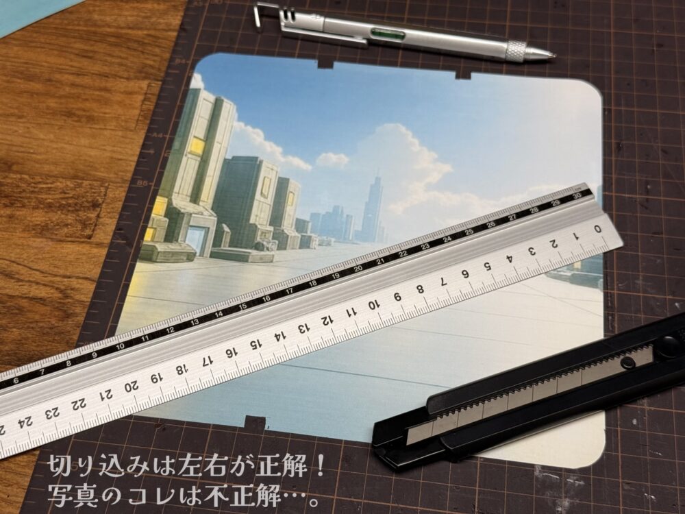 透明棚板の受けがあるので左右に切り込みを入れます。