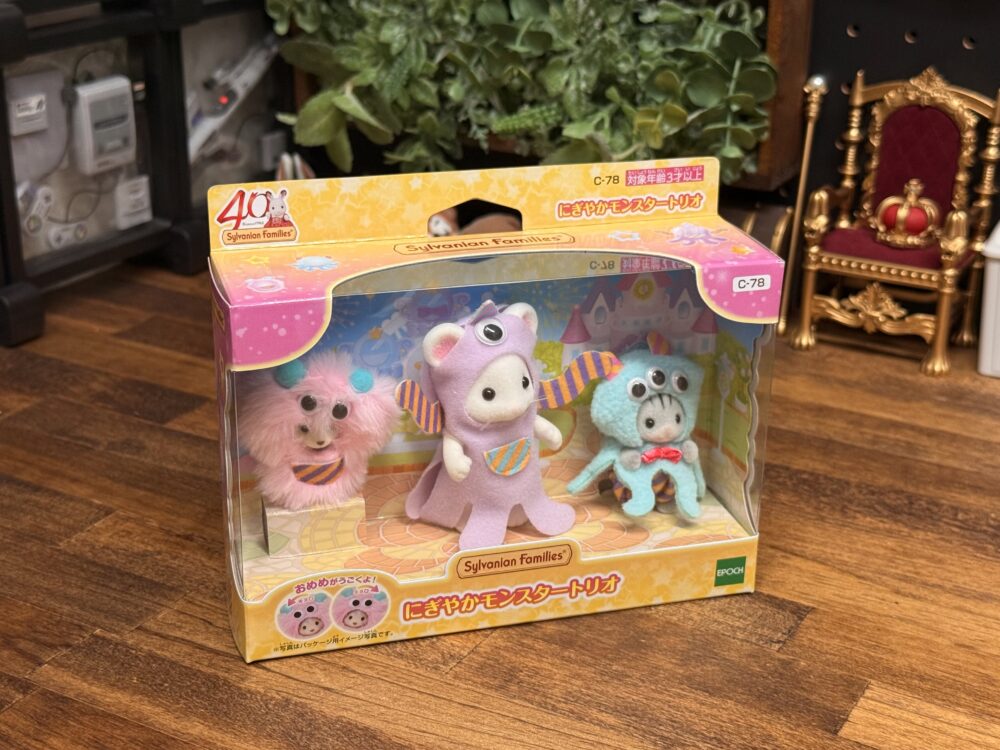 シルバニアファミリー40周年記念で発売されたドン・キホーテとユニー限定の「にぎやかモンスタートリオ」のレビューでした。