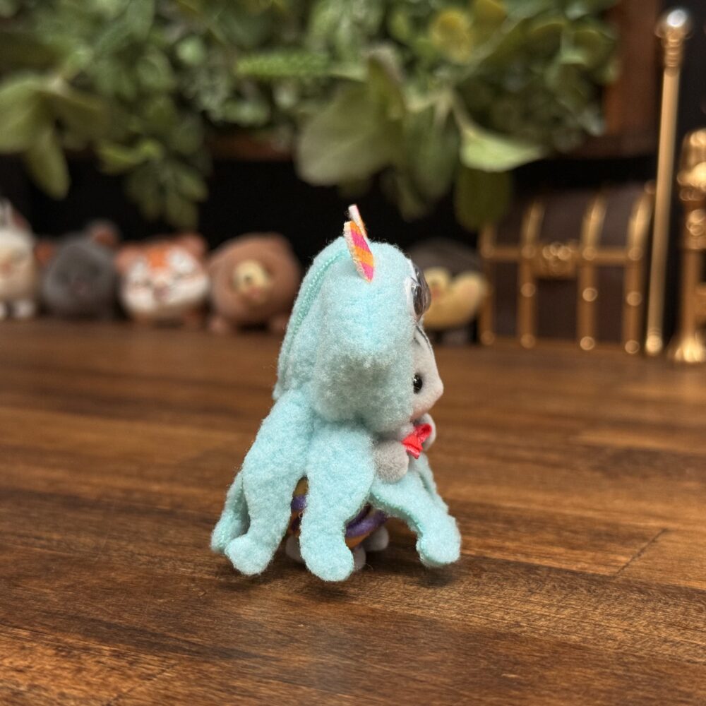 マシュマロネズミの「クリストファー」は薄い紫色をした一つ目のモンスターの衣装を着ています。パーティーハットやポケットのストラップ柄が可愛いです。