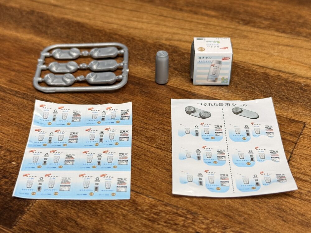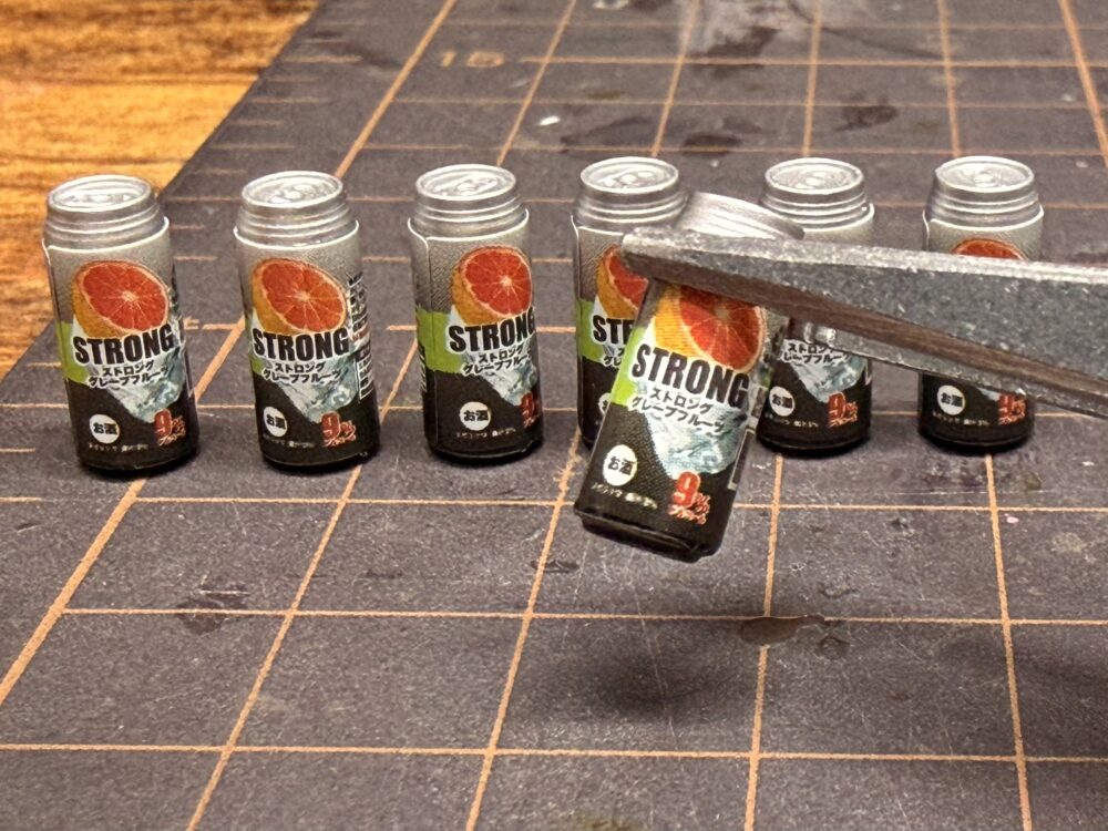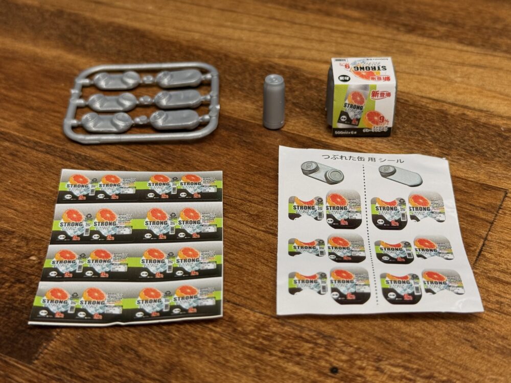 缶のステイオンタブの造形や空き缶の潰れ具合など造形もしっかりしていて、パックやシールの彩色も綺麗なので1/12スケールとは思えないクオリティでした。