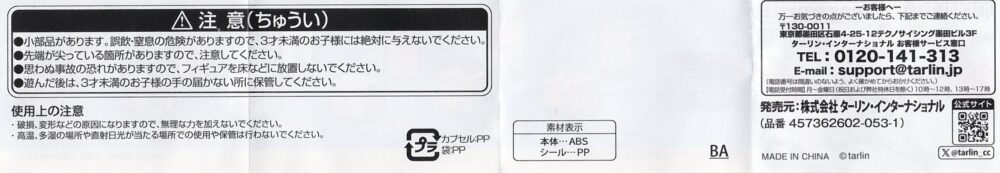 ターリンのミニブックは表面がカラープリントなのでラインナップを見るのが楽しいですね。「次はこれが欲しいなー」ってついてい見ちゃいます。裏面は注意書きと連絡先が記載されていて、素材表示には本体…ABS・シール…PPと記載されてました。