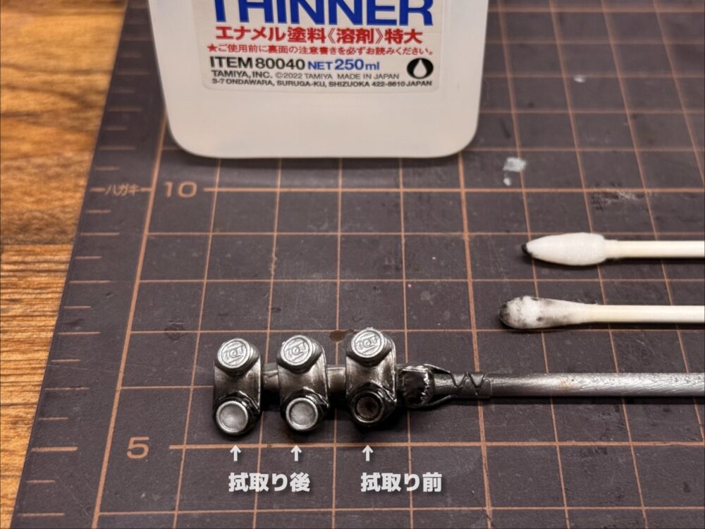 コツとしては下地の塗装を十分乾かしクリア塗装をするとさらに安全です。実際のエナメル溶剤を拭き取る作業はこまめに綿棒を取り替えないと綿棒に付いた塗料が広がっちゃいますよ。