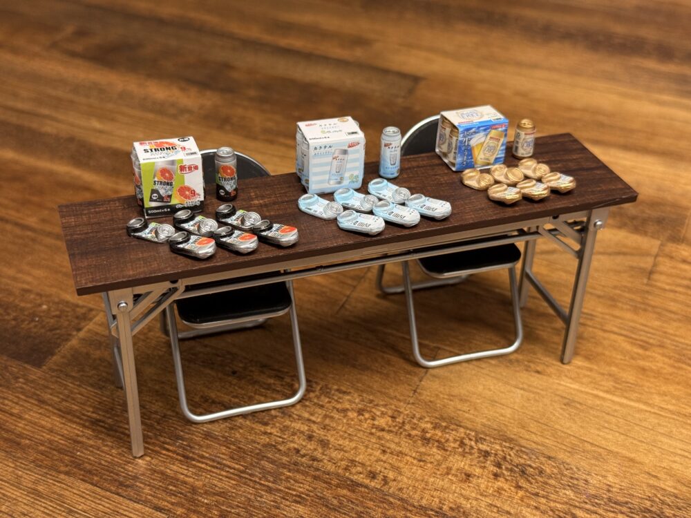 家飲みを再現したいけどやっぱり山田化学の「ミニチュア会議机」と「ミニチュアパイプ椅子」に並べた方が見映えが良いので使っちゃいますね。