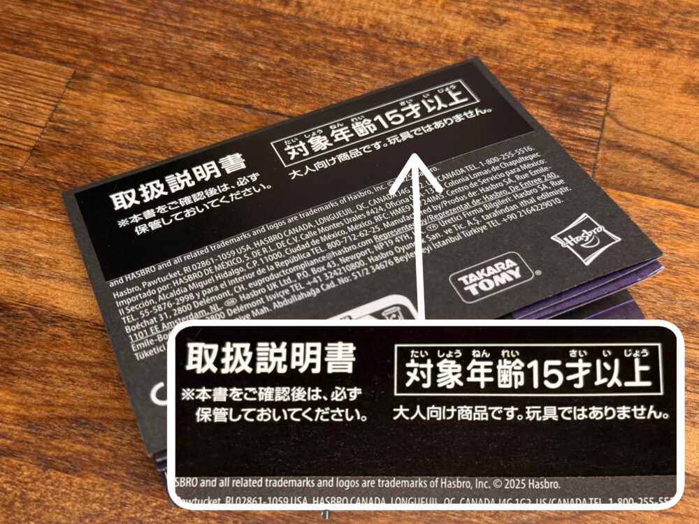 取扱説明書には対象年齢15才以上と書かれててその下には「大人向け商品です。玩具ではありません。」と書かれてました。