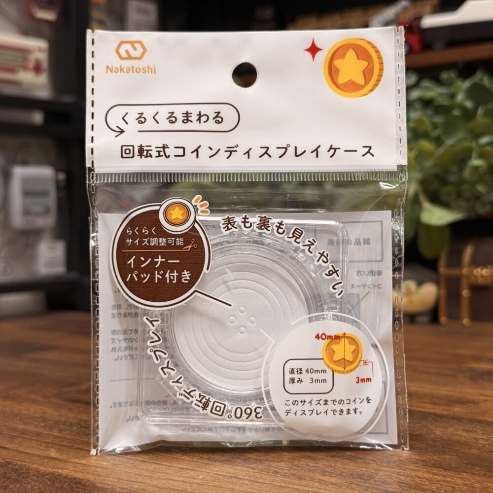 文房具・雑貨メーカーのナカトシ産業㈱から販売されたディスプレイしたコインを回転させて楽しめる、回転式のコインディスプレイケースです。サイズ調整が簡単におこなえるインナーパッドも付属している為、買ってすぐに使えるのが嬉しいですね。