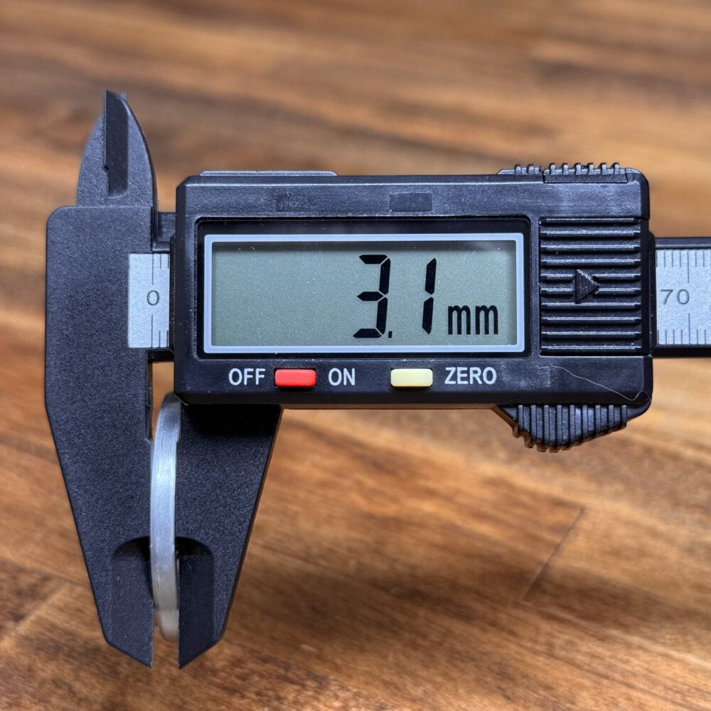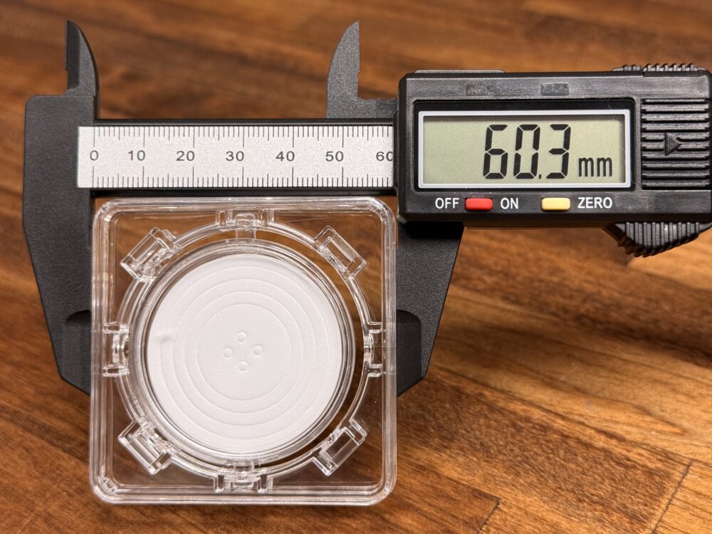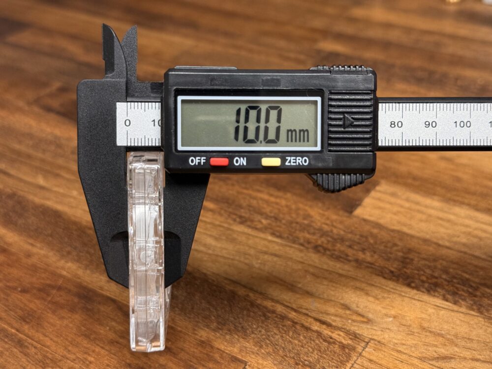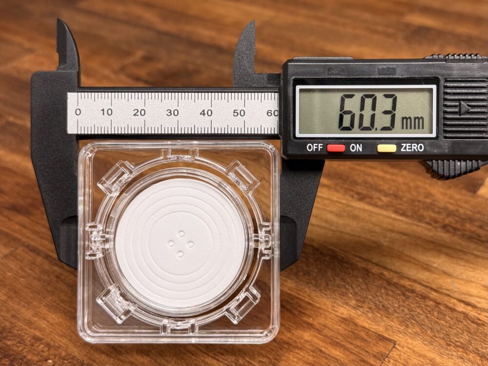 まずは商品サイズの確認です。パッケージには高さ60.0mm×横幅60.0mm×厚さ10.0mmと記載されてましたがデジタルノギスで測ってみるとほぼ合っている事が分かります。角が丸みを帯びていている為、触り心地も良好でした。