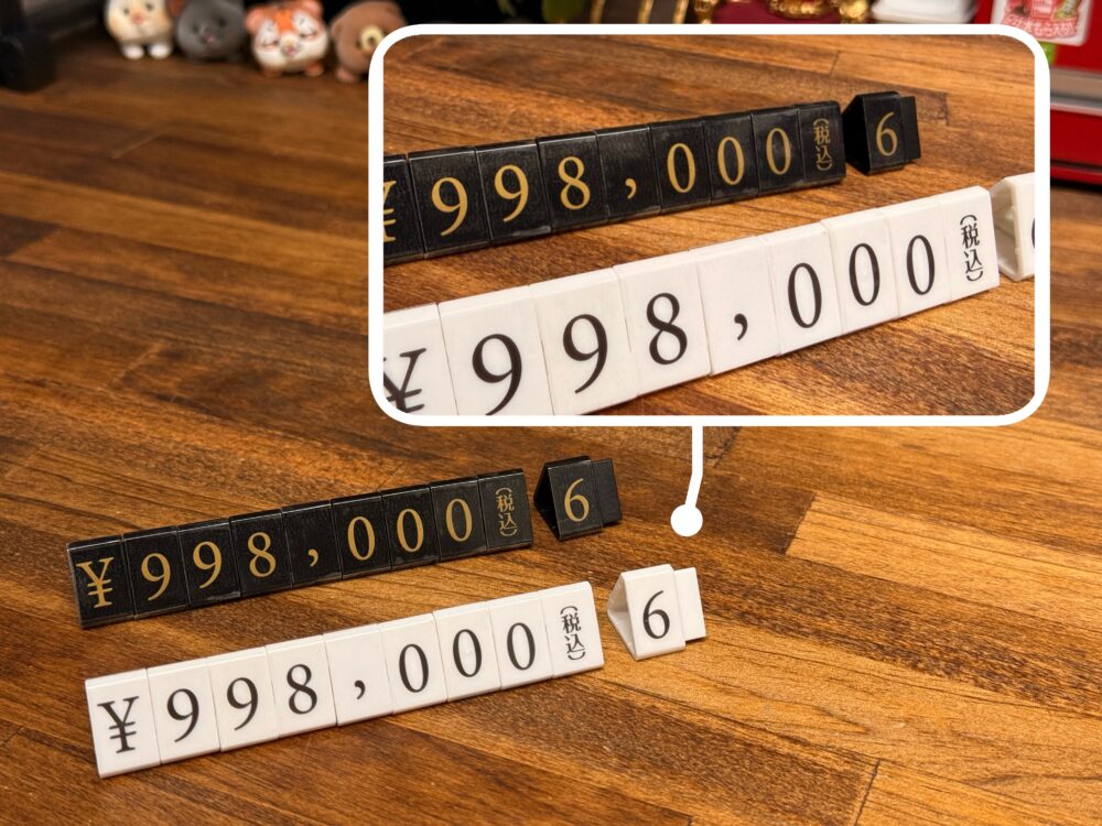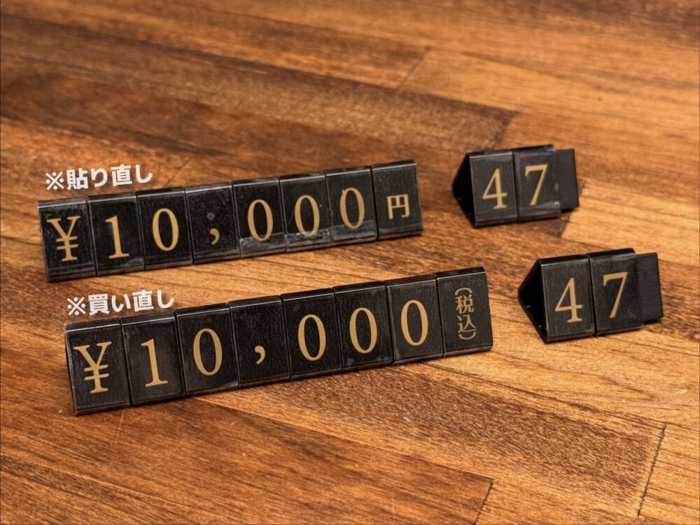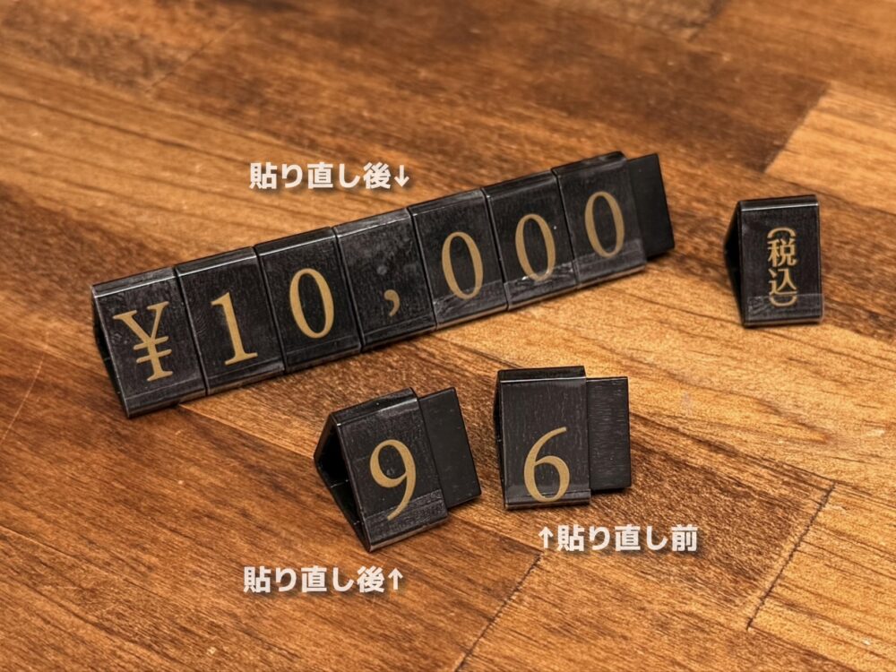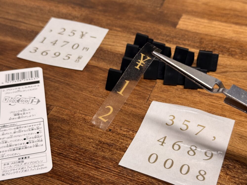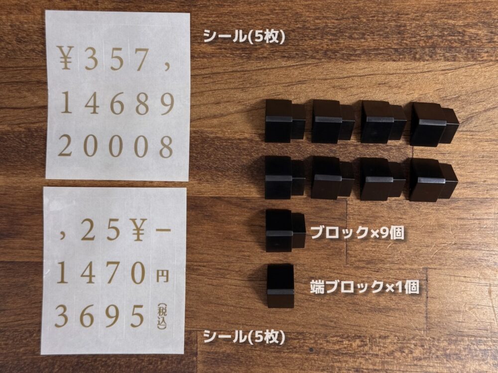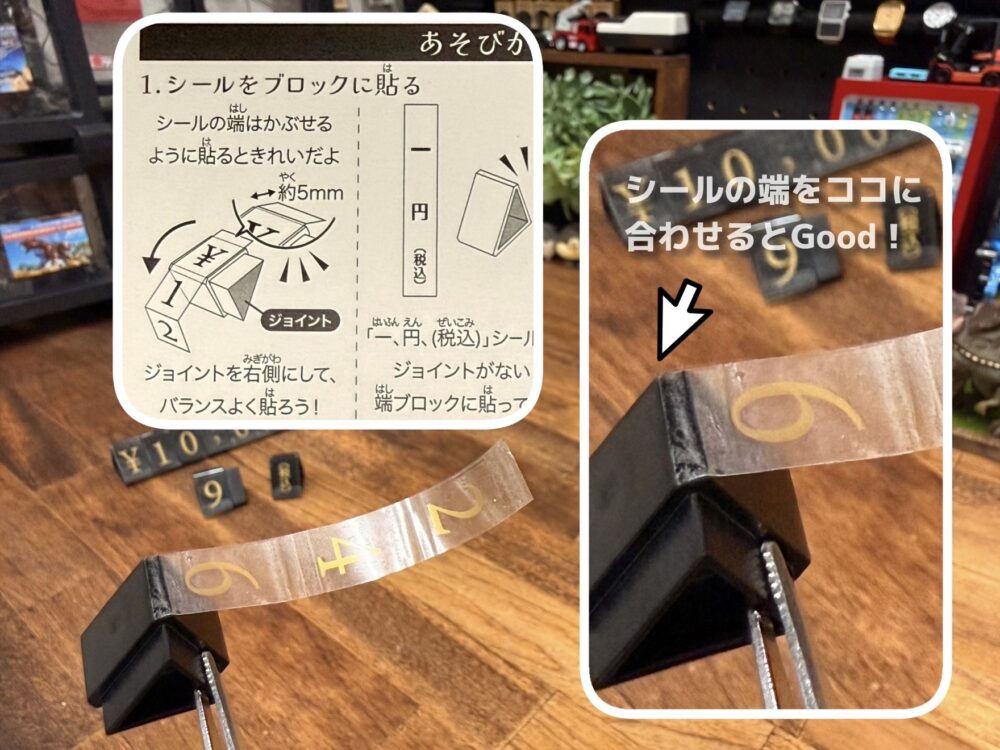 シールを貼ったブロックを組み合わせて値付けしてみました。説明の通りに貼ってみましたがちょっと文字が下に寄ってますよね。