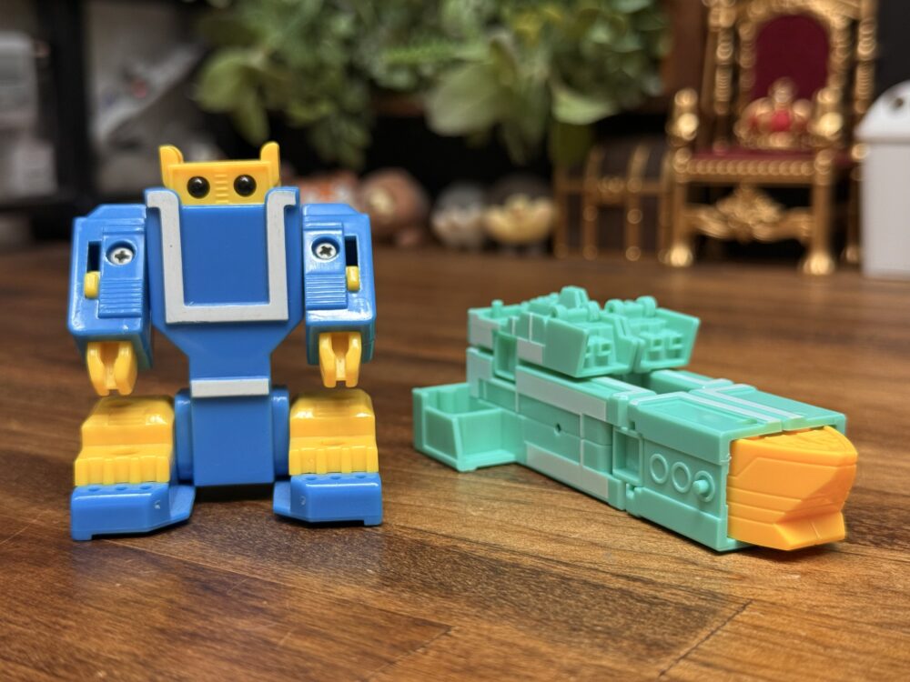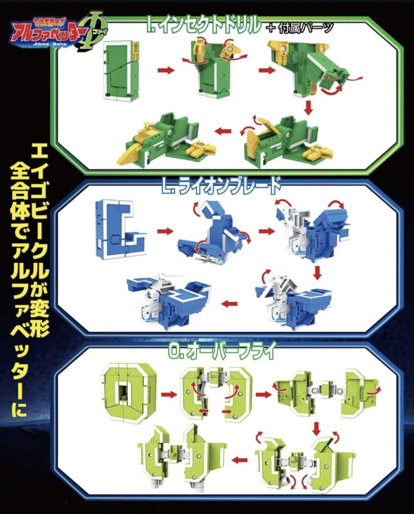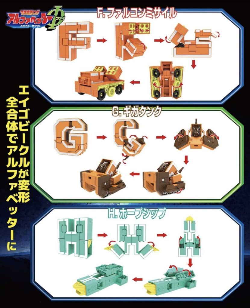 同じアルファベットから変形する玩具ですが、変形の工程は勿論ですが、ロボットではなくエイゴビークルに変形し、合体ロボになるので全然異なるおもちゃでしたね。