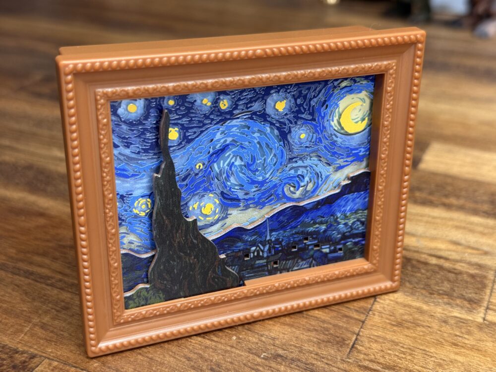 1層目の背景に動く3つの円が仕込まれていて、2層目は透明のパネルに空の渦巻きが描かれています。3層目には夜の街並みが描かれていて、動きはないものの明かりが付いたり消えたり(色で表現)したり、4層目の糸杉は可動するといった、シリーズの中で1番仕掛けが豪華です。