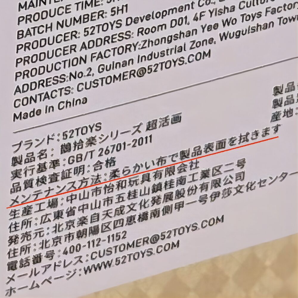 BOXの背面には中国語と英語と日本語で連絡先やメンテナンス方法などが記載されてます。