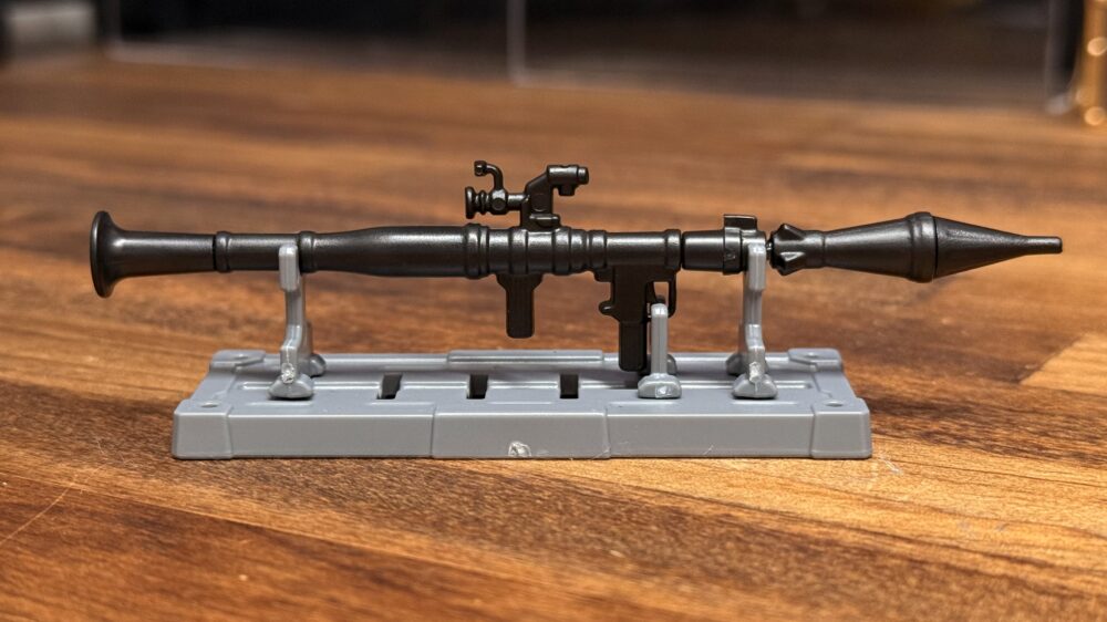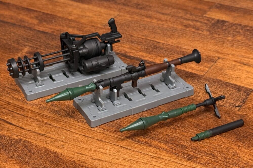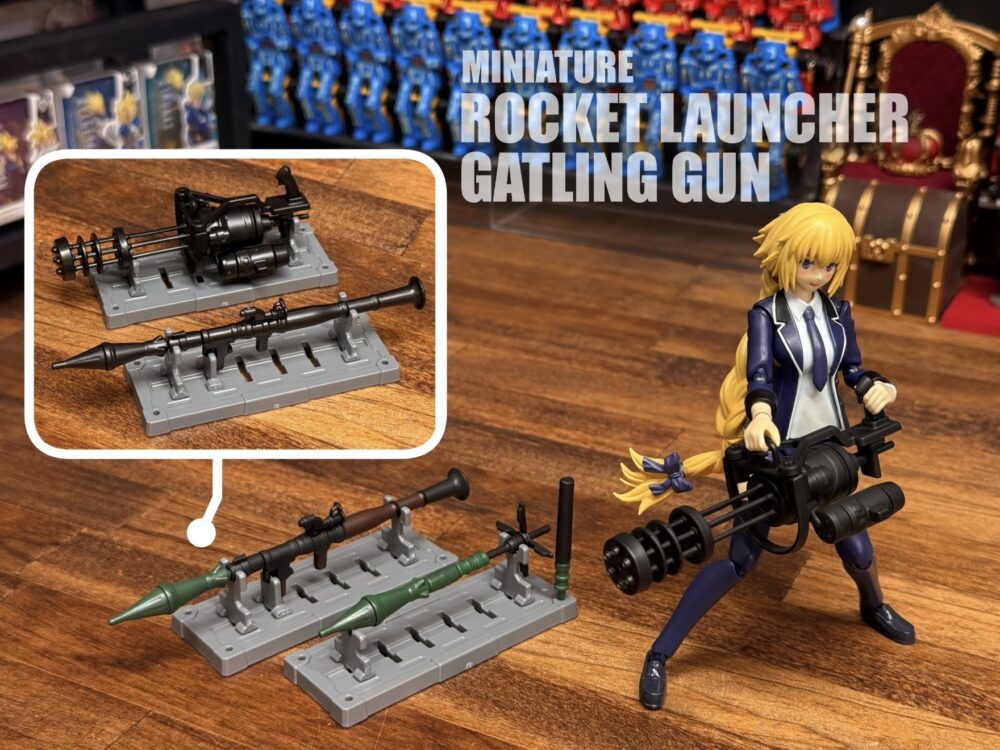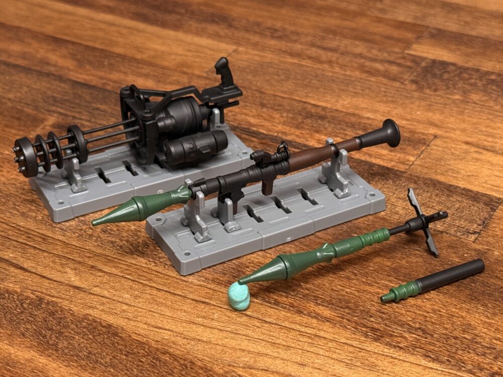 「ミニチュアガトリングガン」には特にギミックはありませんが「ミニチュアロケットランチャー」には差し替え式で発射後と持ち運び時の弾頭に替えるギミックは◎。