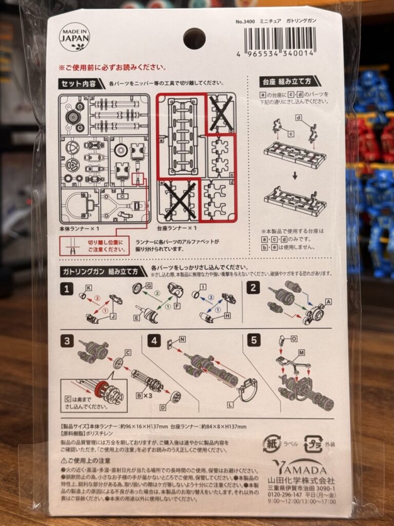 これまでの山田化学の「ミニチュアウェポンシリーズ」は1/12スケールで統一されていましたが、さすがにボリュームのある「ミニチュアガトリングガン」は1/12スケールでの再現は無理だったみたいです。