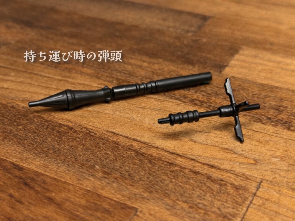 パーツを差し替える事で持ち運び時の弾頭にできる為、遊びの幅が広がります。