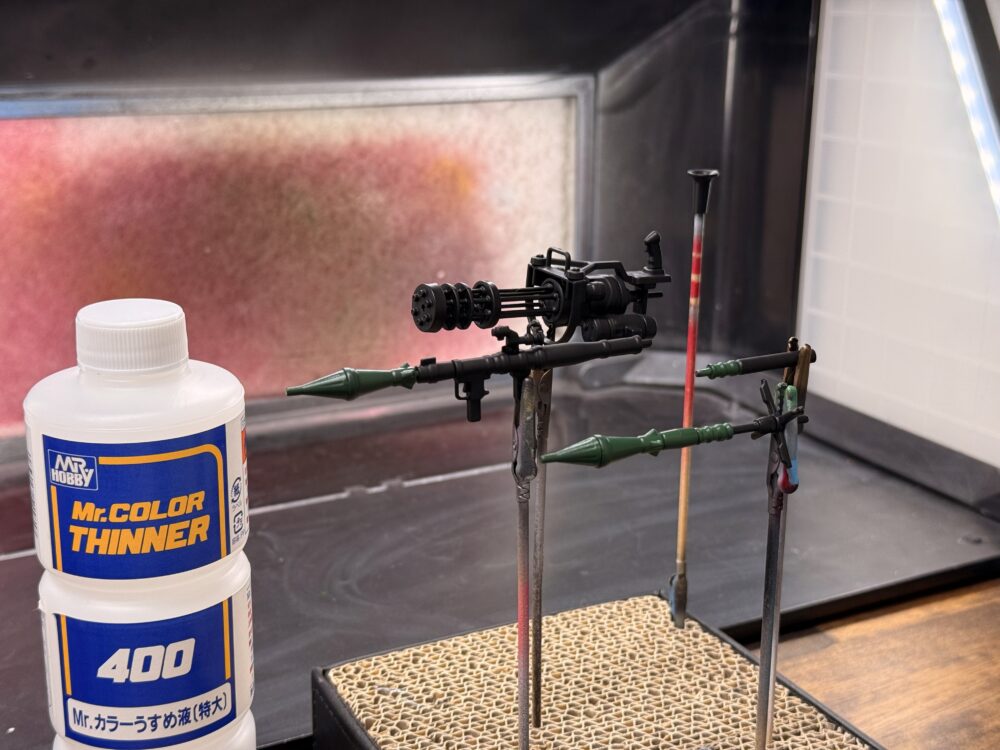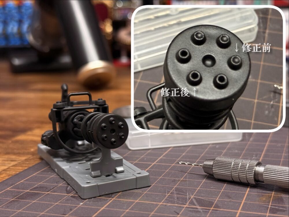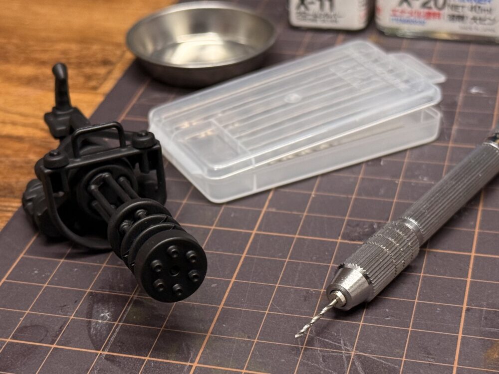 ガトリングガンの方は黒色に塗っただけなので、銃口のモールドが浅いのをピンバイスを使って銃口を深したいと思います。