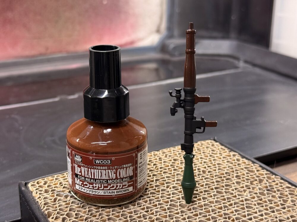 木製の部分は木目調にしたいので「Mr.ウェザリングカラー」を使用しました。乾いたら半光沢のクリアを吹く予定。