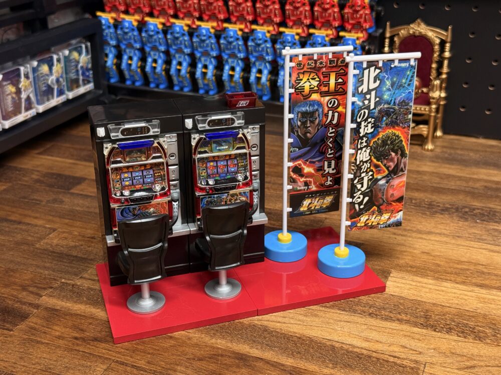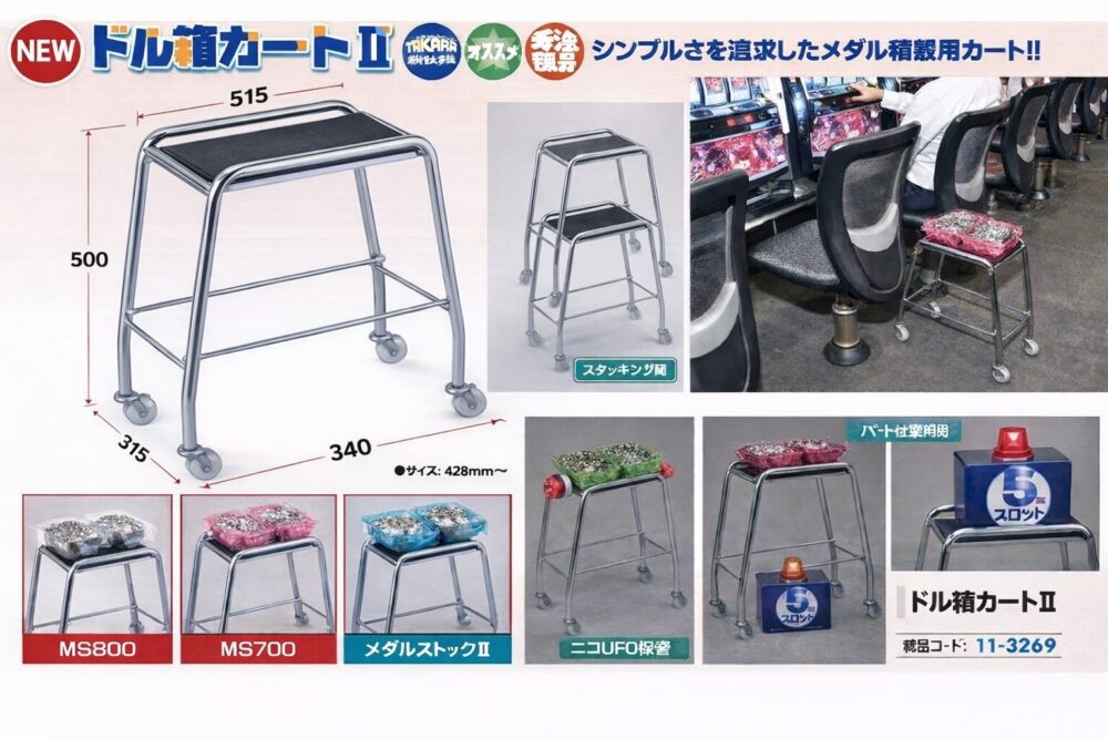 こちらが2000年頃にプライズに登場した「パチスロホールキット」になります。約26年経ったいま見ても全然見劣りしないクオリティ!これだけでも十分ですがやっぱり「ドル箱カート」が欲しくなりますよね。