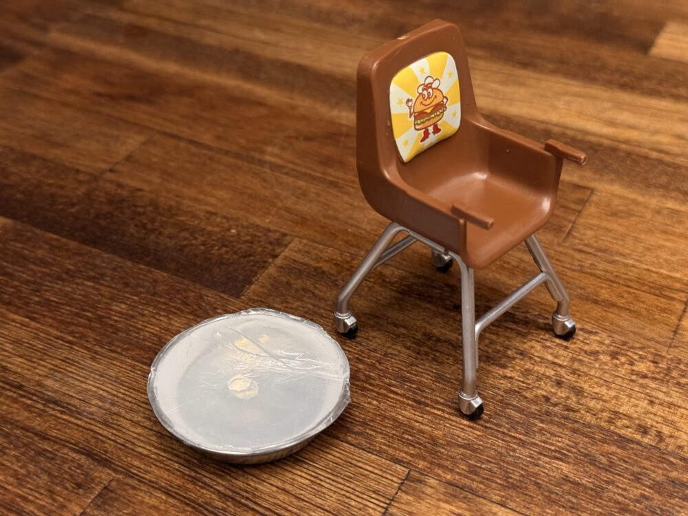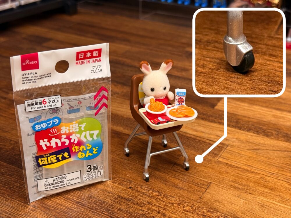 今回「パチスロホールキット」の追加パーツを作るのに必要なパーツがこちらのキッズチェア(トレイ付き)の滑車(コロ)パーツです。