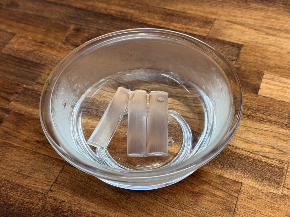 まずはこの固い「おゆプラ」を80度以上のお湯に3分入れて置くと普通の粘土の様に柔らかくなります。