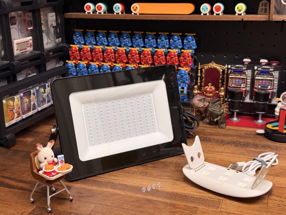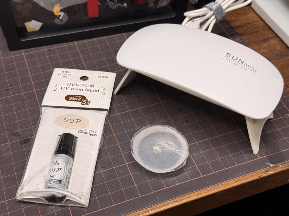 今度はパーツ複製に入ります。使用するのは100円ショップで買える「UVレジン液」と先程「おゆプラ」で型取りした型、そしてUVレジン液を硬化させるUVライトです。