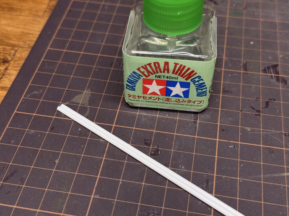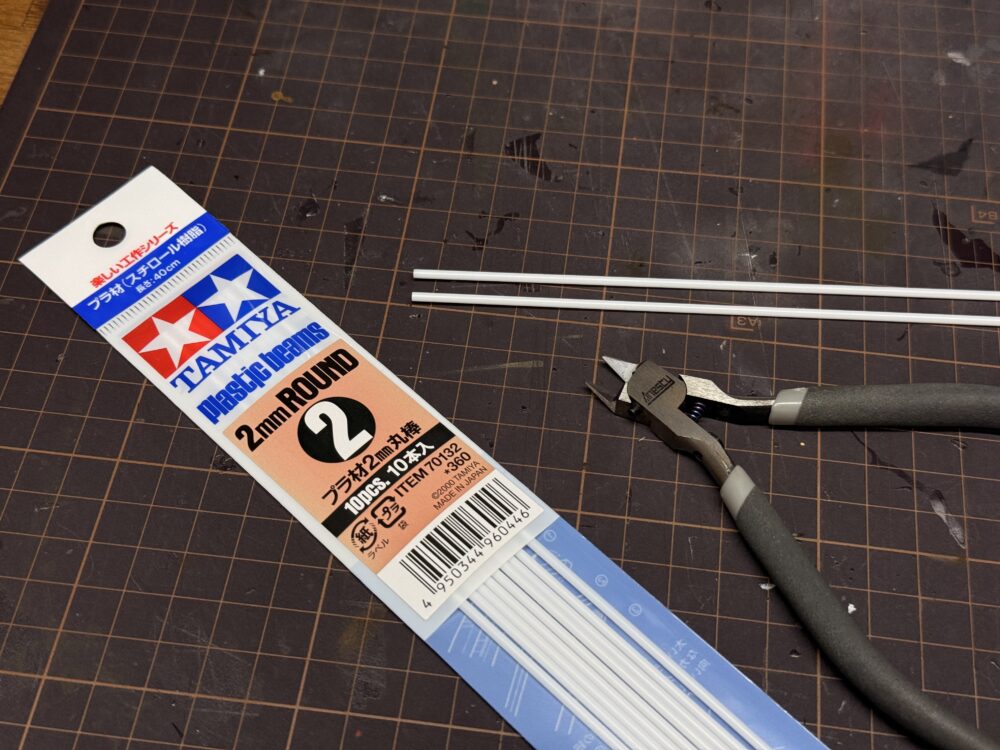 「プラ材2mm丸棒」だけで作るつもりでしたがちゃんとプラ棒の太さを変えた方がリアルなので、残りは「プラ材1mm丸棒」を使用しました。