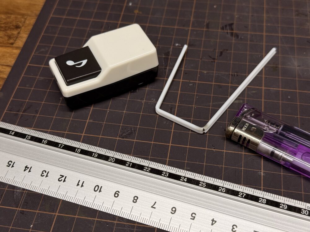 軽くライターの火で炙りプラ棒を温めて折り曲げます。左右対象にする為に何かの角を使って曲げる事をおすすめします。