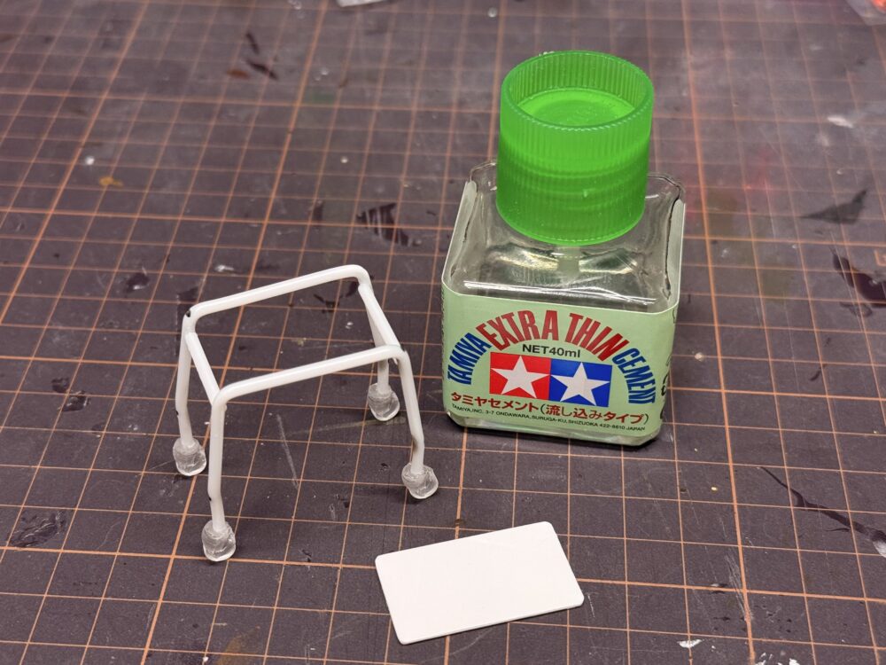 同じ要領でプラ棒を曲げて長さを揃え、接着したプラ棒をカッターやデザインナイフでカットしましょう。接着した部分が荒れているのでヤスリ掛け推奨。僕はヤスるのを忘れちゃいました。