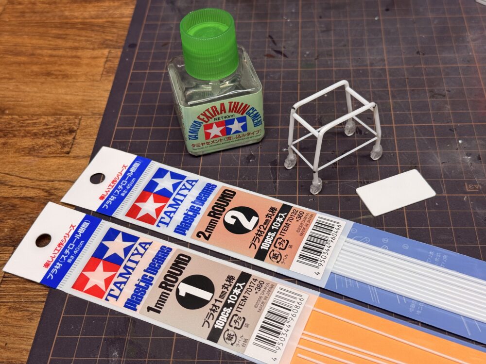 1/12スケールのドル箱カートを作るのにSeriaで買える「プラ板」とタミヤの「プラ材2mm丸棒」を使用します。