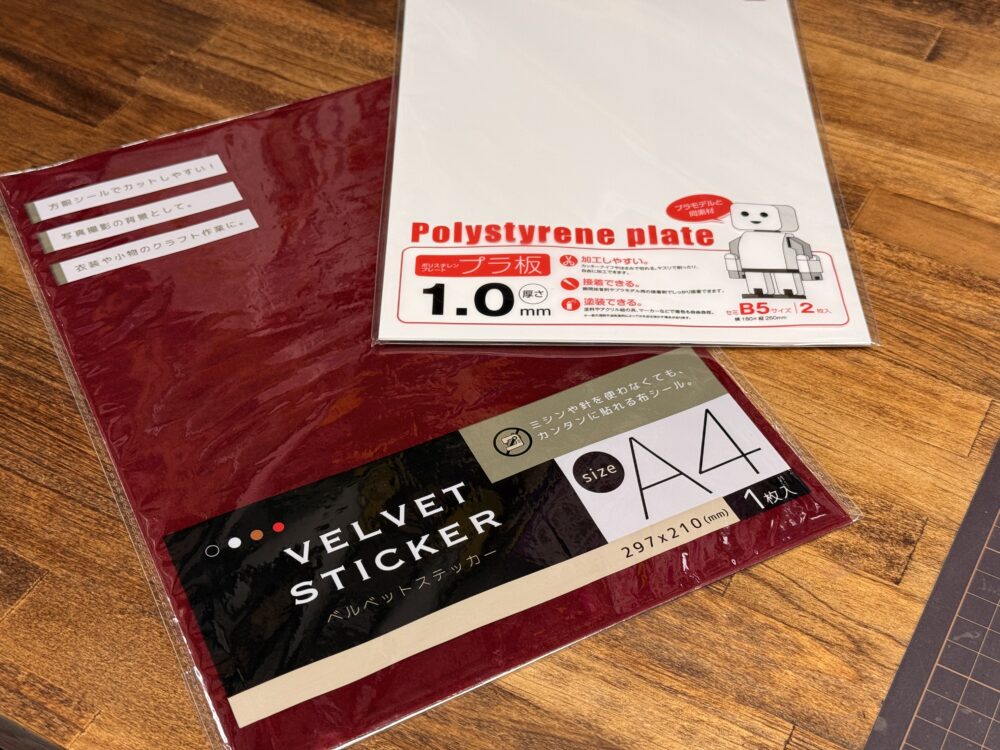 Seriaで買える「プラ板(1mm)」とこちらも過去にSeriaで販売されていた「ベルベットステッカー」を使用しました。(現在は廃盤になっていると思います。)