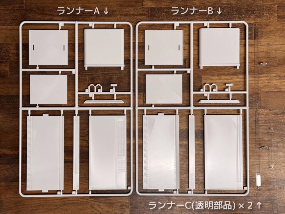 「1/12 コンビニ用冷凍ショーケース プラモデル」は白色のランナーが2枚と透明のランナーが2枚の合計4枚(部品点数は23点)で構成されています。