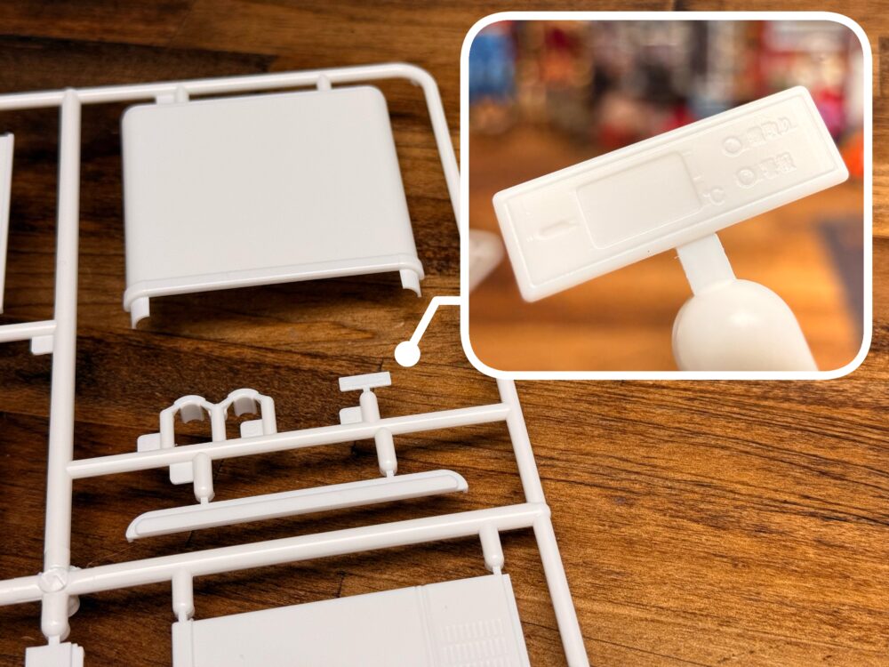 組み立ての前に少しパーツを確認。冷凍ショーケースの操作パネルには小さな文字で「霜取り・警報」の文字も再現されてました。