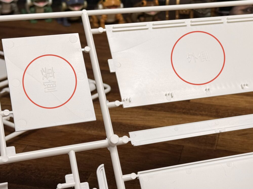 今回はパーツの向きが分かりづらいパーツには「外側・裏側」の文字が造形されています。