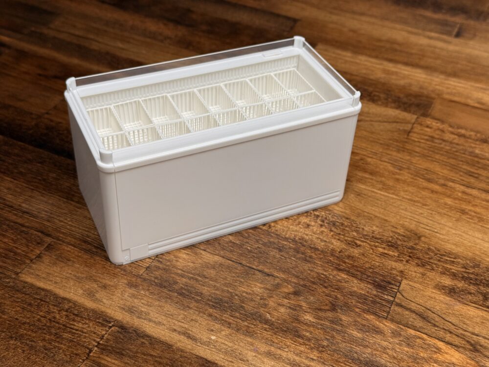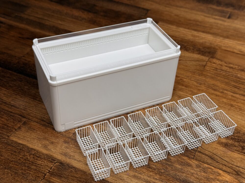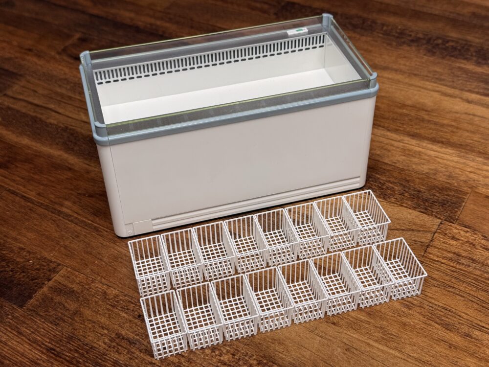 ほ完成した冷凍ショーケースにバスケットを入れてみます。ショーケースの底の高さは2種類から選べますが、写真は浅い方にしています。
