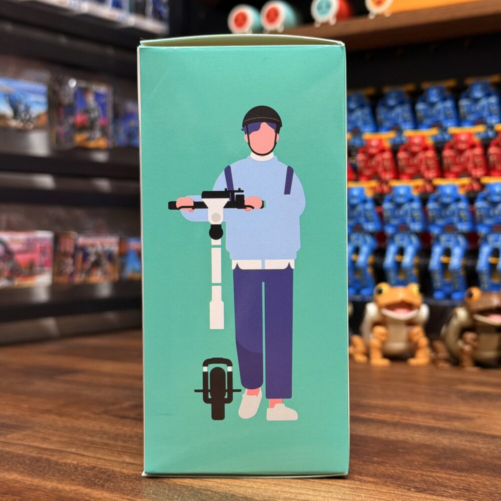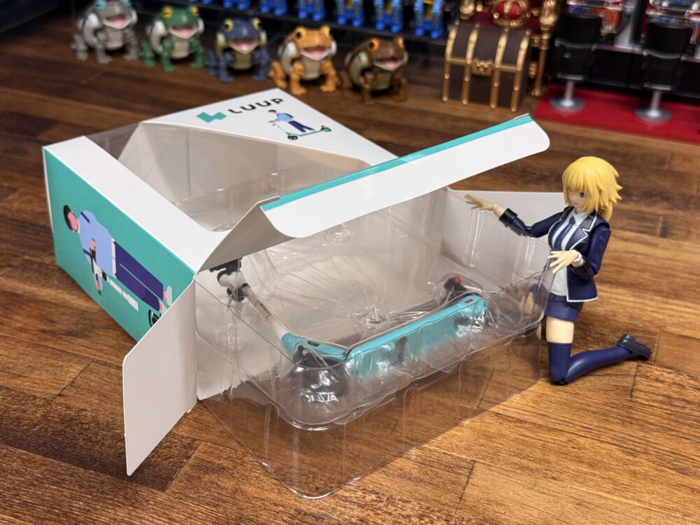 まずはパッケージの確認を行いたいと思います。パッケージはウインドウパッケージになっていて中の製品が確認できます。背面には製品画像LUUPの電動キックボードに乗った青年のイラストが描かれてます。