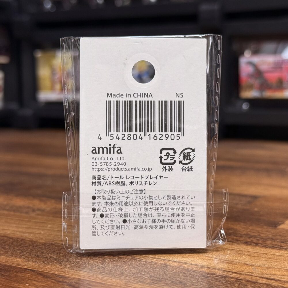 まずはパッケージの確認です。透明な袋に商品のミニチュアと台紙が入ってます。台紙の表面には商品名である「Doll Record Player」の表記があり、裏面に注意事項や材質などが記載されてました。