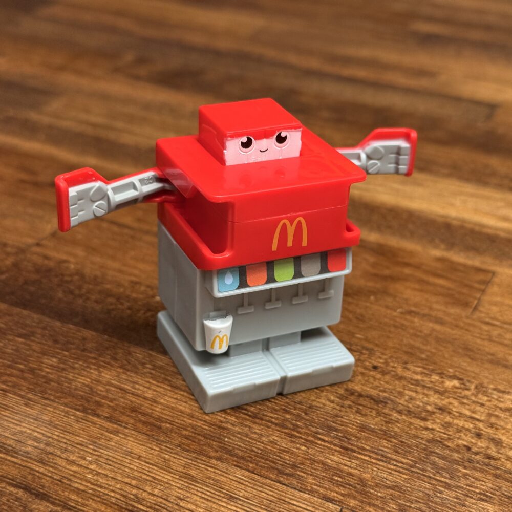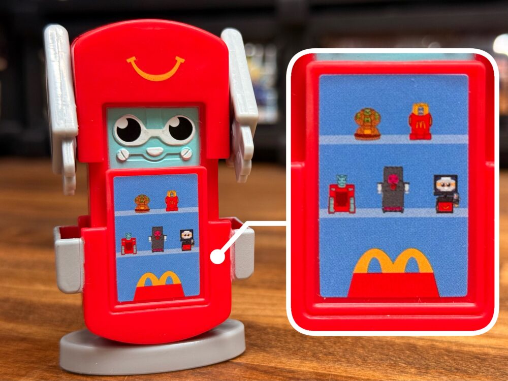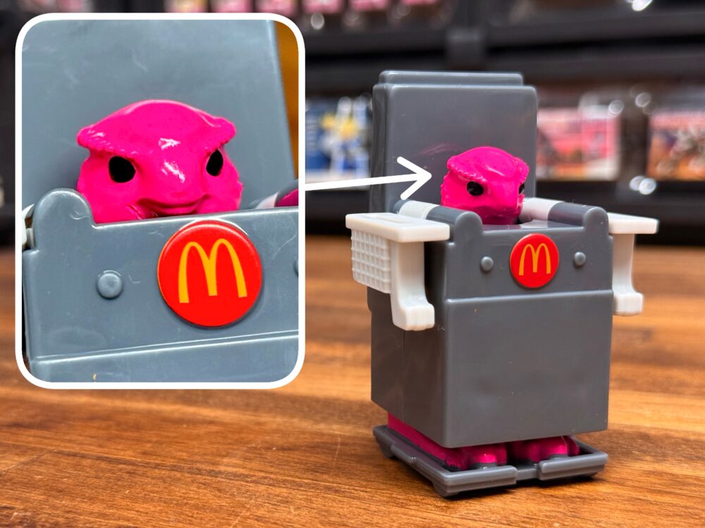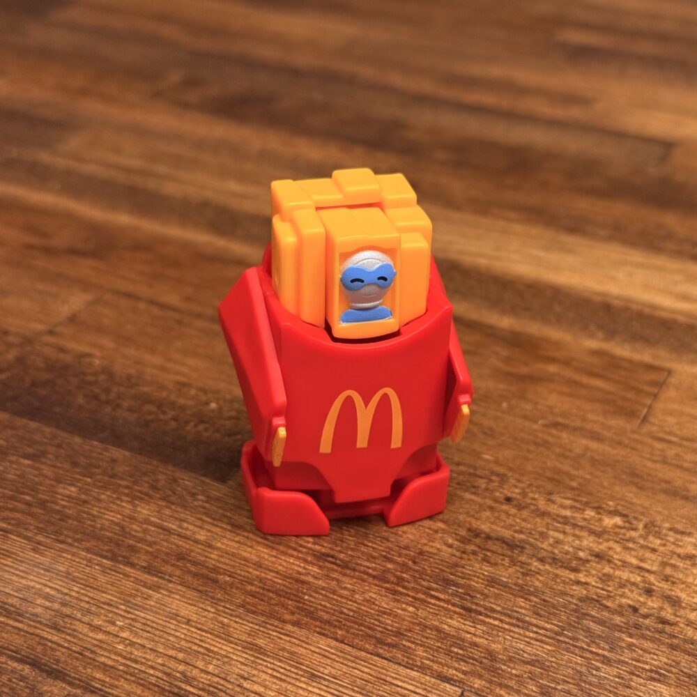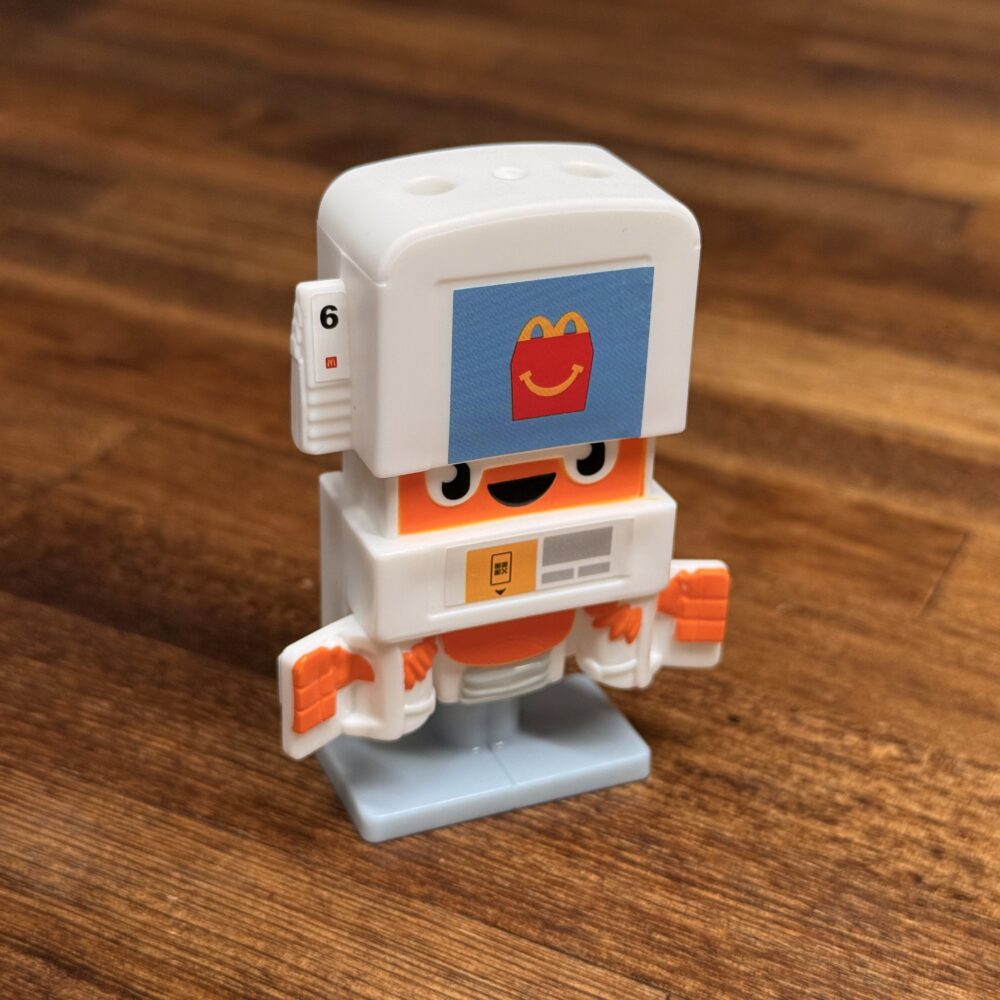 ポテトの中心から顔を覗かせているのを見ると小さいロボがポテト型のロボットに乗っているみたい。マクドナルドのロゴはプリントでロボと指先は塗装されてます。