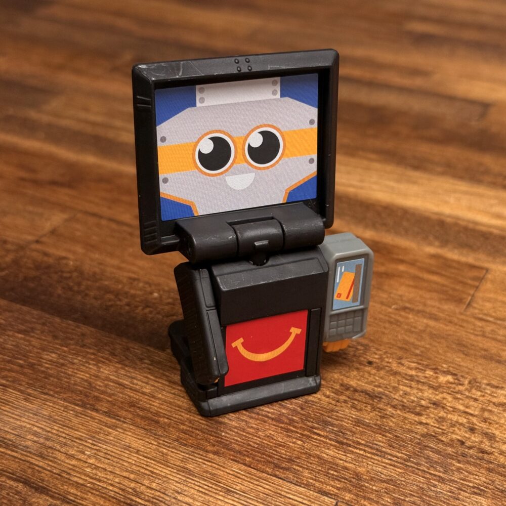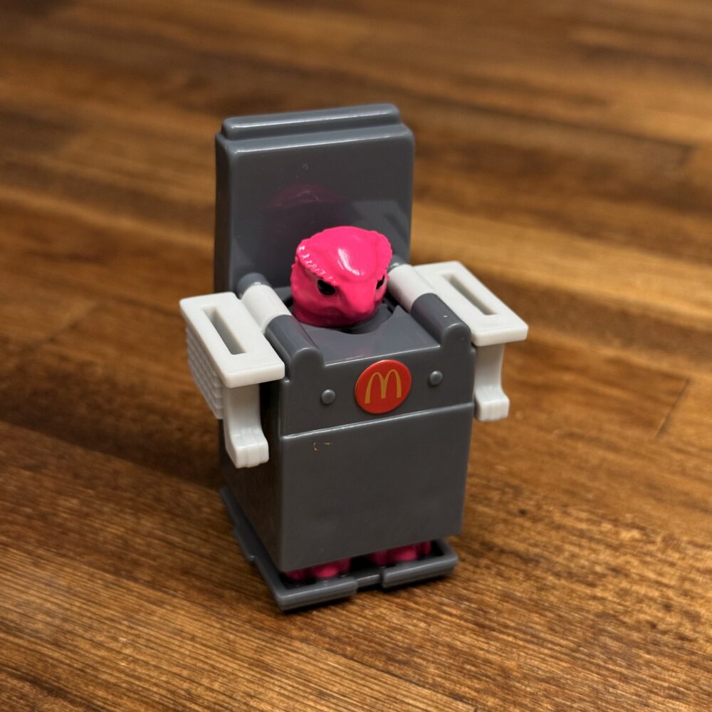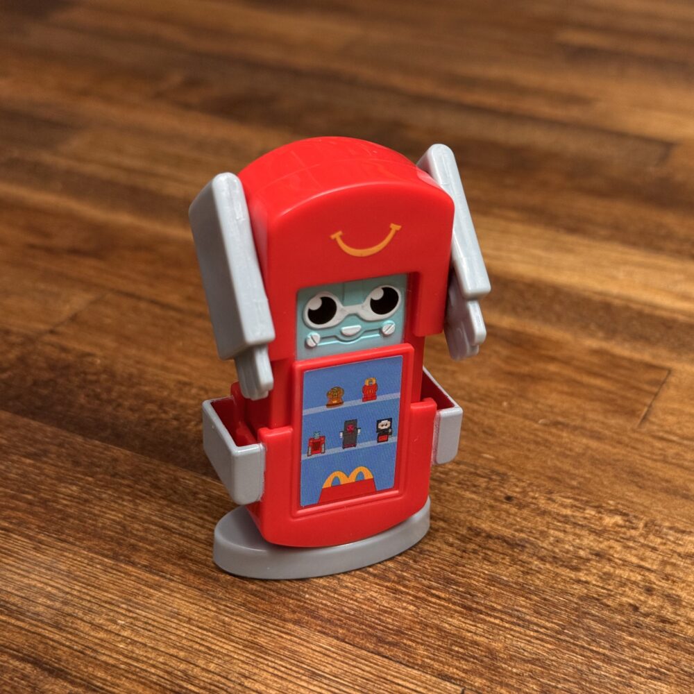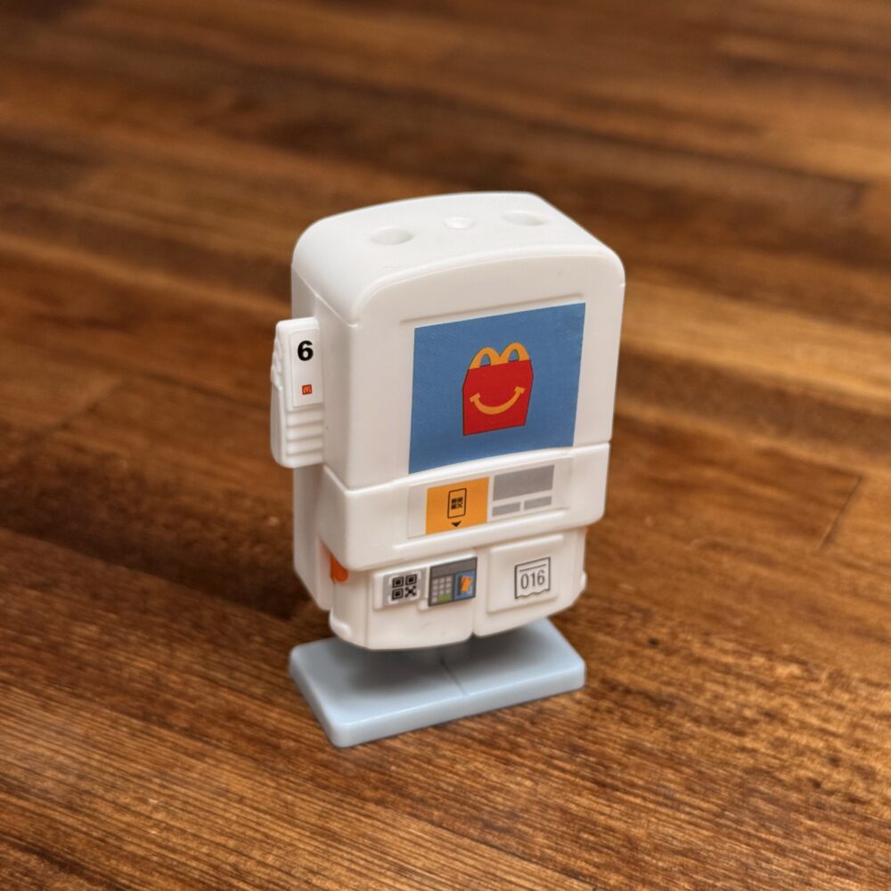 ポテトの中心から顔を覗かせているのを見ると小さいロボがポテト型のロボットに乗っているみたい。マクドナルドのロゴはプリントでロボと指先は塗装されてます。