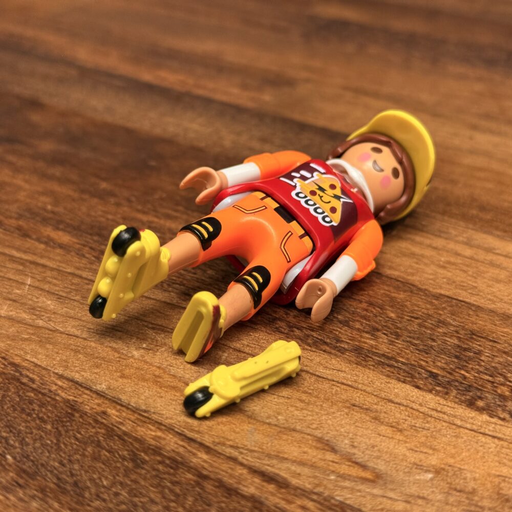 パーカー付きの可愛いピザ屋の作業服。写真では伝わらないと思いますが、特に黄色とオレンジ色のプラスチックが安っぽい質感なのは正直にがっかり…。